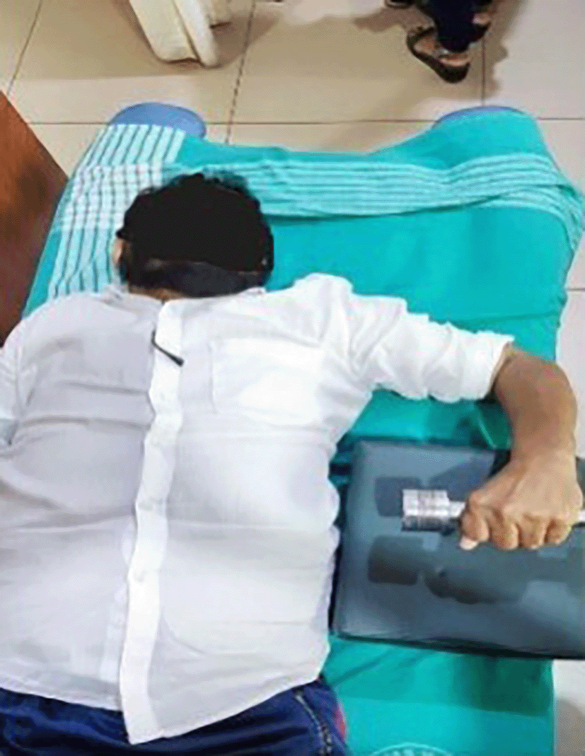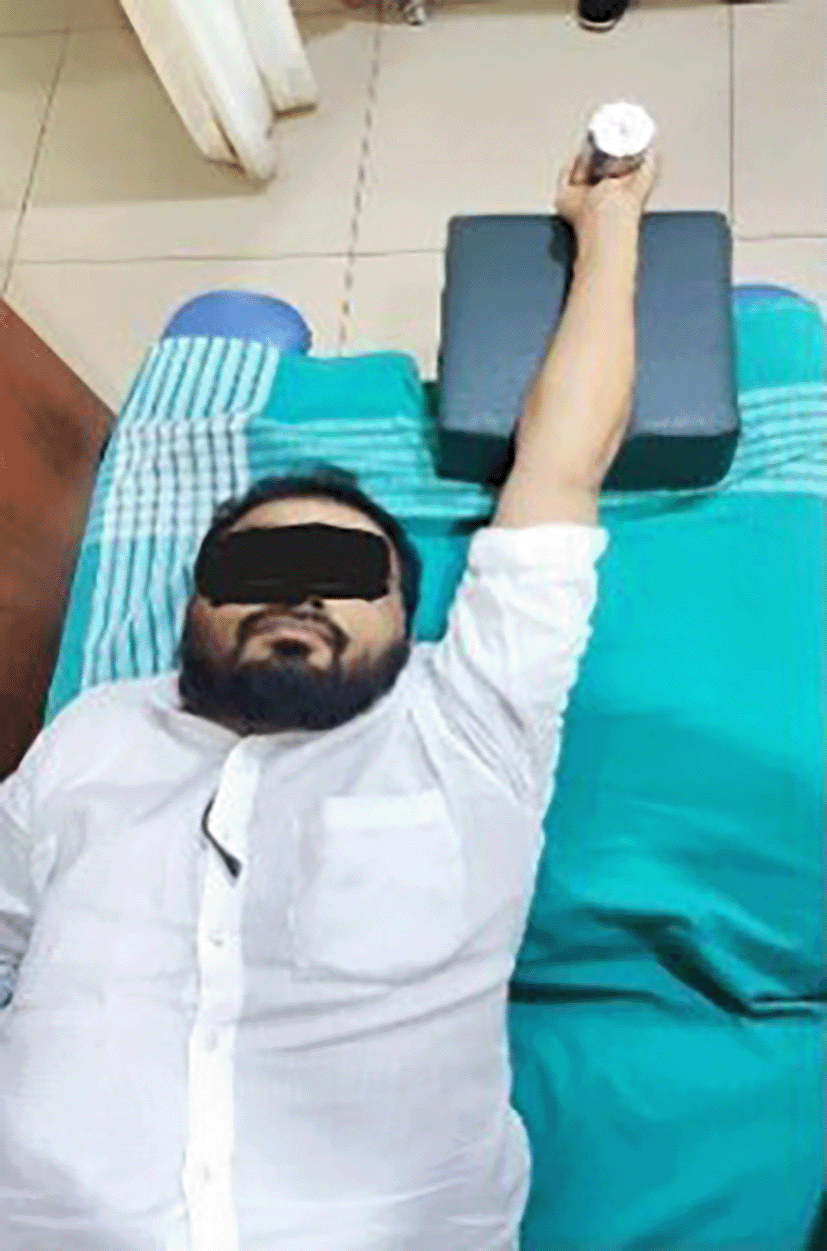 External rotators: Participants were positioned in crook lying with the shoulder abducted and elbow flexed at 90°. They were instructed to perform active internal rotation using a 1 kg dumbbell, followed by passive external rotation performed by the therapist up to mid-range. During internal rotation, the external rotators undergo eccentric contraction.17