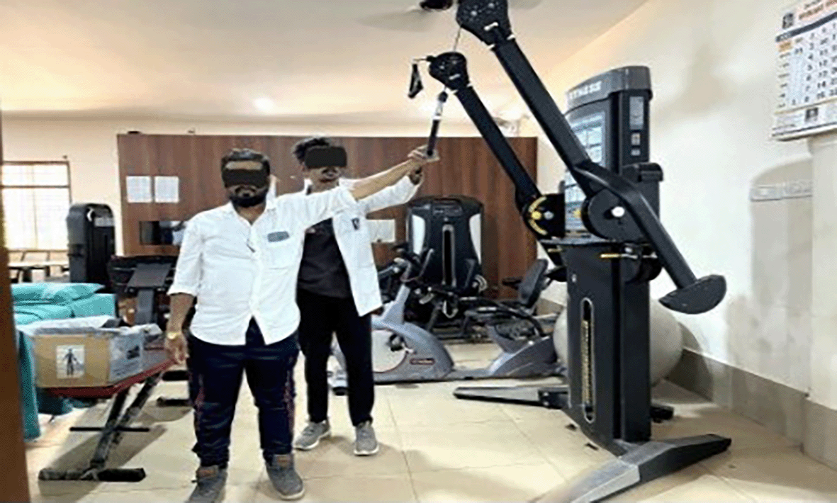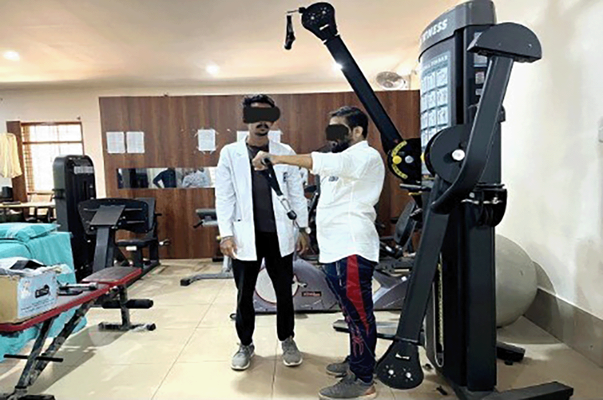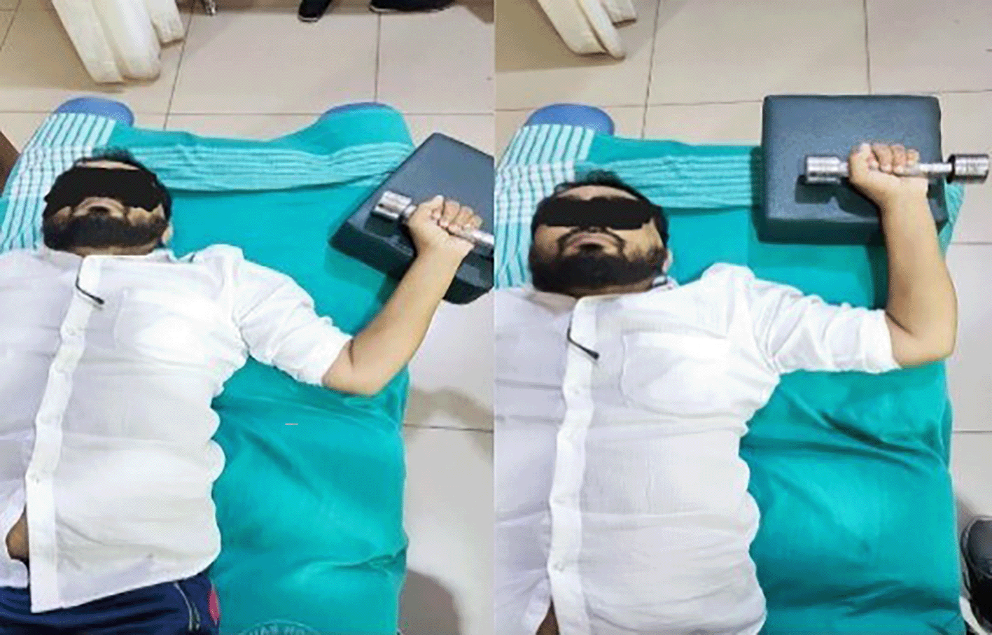 The study was conducted at an outpatient department in a medical college Hospital after obtaining approval from the authors affiliated institutions. This is a single group pre-post design which included 20 patients with FS with mild-moderate disability. The clinical trial registration number for the study is CTRI/2023/01/048754. The study was conducted from December 2022 to October 2023. The inclusion criteria were age between 40 and 65 years of both the gender, diagnosed case of frozen shoulder (equal limitation of active range of motion and passive range of motion and normal X ray) with mild to moderate disability <50% reduction of external rotation when comparing opposite side, for mild disability Pain intensity was 3/10 on numerical pain rating scale, No night pain or sleeping pain, both active and passive range of motion are equally limited, but can tolerate passive overpressure at end range of motion. For moderate disability, pain was 4-6/10 on numerical pain rating scale, periodic ache while sleeping or resting, both active and passive range of motion are equally limited, can tolerate basic shoulder loading. The Exclusion criteria include FS patients with calcifying tendinitis, Greater tuberosity fracture, Necrosis of the humeral head, Rotator cuff related shoulder pain, pseudo-frozen shoulder, Neoplasm, Osteonecrosis, Cervicogenic shoulder pain, Locked dislocation, Glenohumeral osteoarthritis.