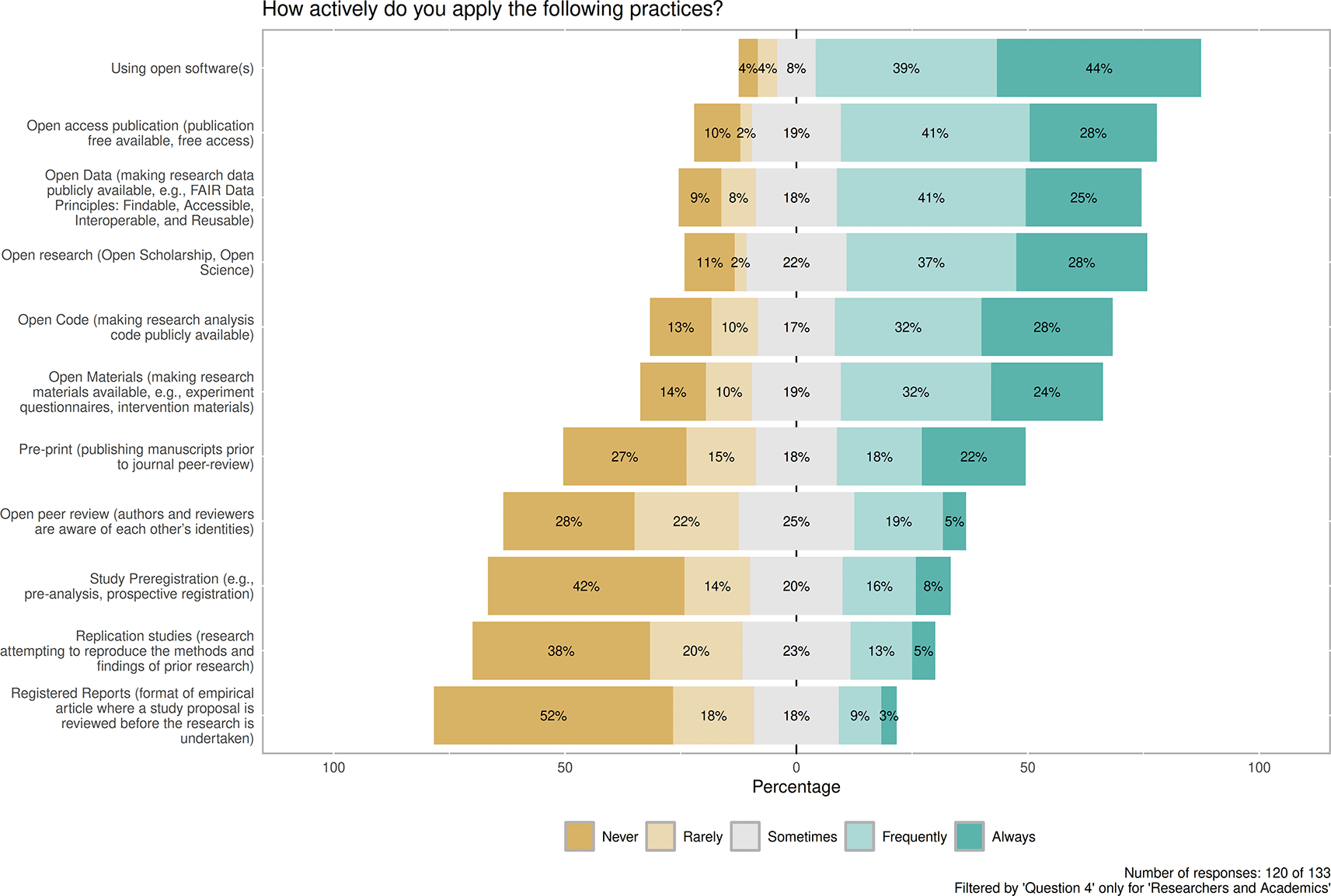 Open data, Open research (including open scholarship), Open code and open materials can be considered as less frequently applied practices among respondents with a range of 68–79 from 120, 56-66% of Frequently or Always replies.