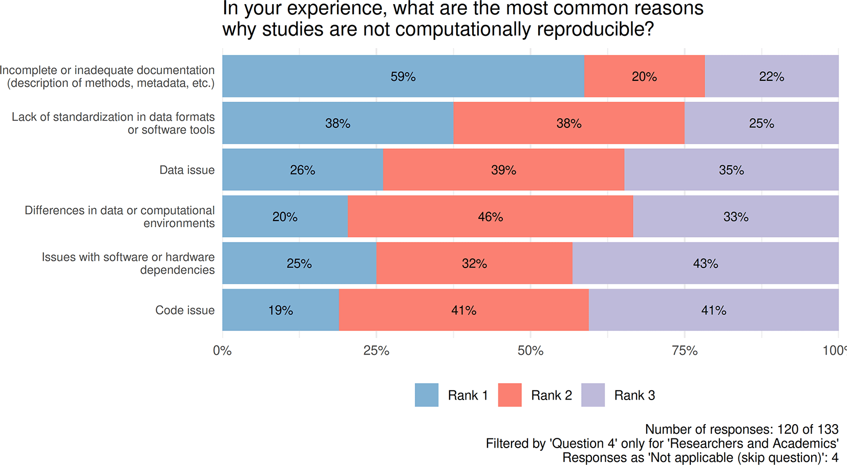 In the question of revealing barriers to reproducibility (Figure 2), respondents were asked to select and rank three items deemed the most important in their view. Based on the “Rank 1 = 3 points, Rank 2 = 2 points, Rank 3 = 1 point” conversion, Incomplete or inadequate documentation received a score of 287 (3 × 120 × 59% + 2 × 120 × 20% + 1 × 120 × 22%) at first place, followed by Lack of standardization in data formats or software tools with 258 points (3 × 120 × 38% + 2 × 120 × 38% + 1 × 120 × 25%), and Data issue with 229 points (3 × 120 × 26% + 2 × 120 × 39% + 1 × 120 × 35%).