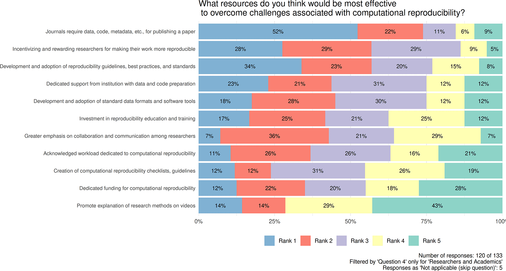 Transparent and computationally reproducible research requires effort from researchers, accompanied by appropriate resources. A question to capture opinions about these resources was framed (Figure 3), asking for the selection and ranking of up to five items that they deemed the most important from amongst the predefined list of 11 (note, Not applicable replies were removed from the analysis). Based on the responses of 120 academics/researchers and on the applied five-point scoring system, the most important driver is whether Journals ask for the necessary data/code/metadata (with scores of 482, 5 × 120 × 52% + 4 × 120 × 22% + 3 × 120 × 11% + 2 × 120 × 6% + 1 × 120 × 9%). This is followed by Incentivizing and rewarding researchers for making their work more reproducible (with a score of 439, 5 × 120 × 28% + 4 × 120 × 29% + 3 × 120 × 29% + 2 × 120 × 9% + 1 × 120 × 5%), followed by Development and adoption of reproducibility guidelines, best practices, and standards (with a score of 432, 5 × 120 × 34% + 4 × 120 × 23% + 3 × 120 × 20% + 2 × 120 × 15% + 1 × 120 × 8%). In the shared 4th place, Development and adoption of standard data formats and software tools, as well as Dedicated support from institution with data and code preparation, both with a score of 394 (5 × 120 × 18% + 4 × 120 × 28% + 3 × 120 × 30% + 2 × 120 × 12% + 1 × 120 × 12% and 5 × 120 × 23% + 4 × 120 × 21% + 3 × 120 × 31% + 2 × 120 × 12% + 1 × 120 × 12%, respectively). The 5th item of the list is Investment in reproducibility education and training with a score of 372 (5 × 120 × 17% + 4 × 120 × 25% + 3 × 120 × 21% + 2 × 120 × 25% + 1 × 120 × 12%).