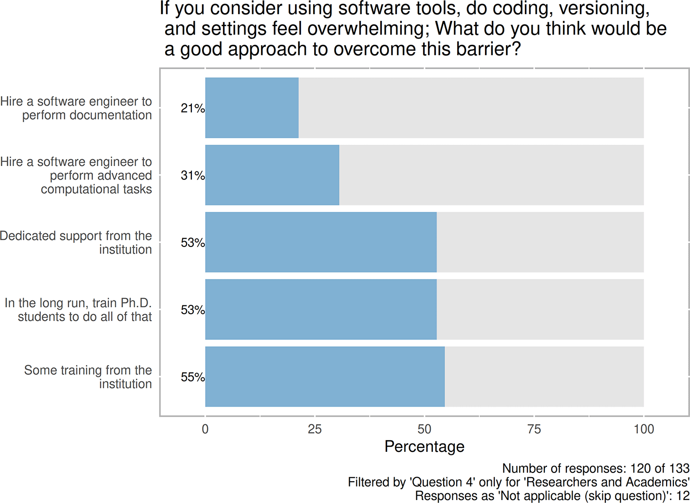 Contains information about predefined and selected options that are considered important to overcome the barriers of computational reproducibility. Number of responses: 120 of 133. Filtered by 'Question4' only for 'Researchers and Academics'.