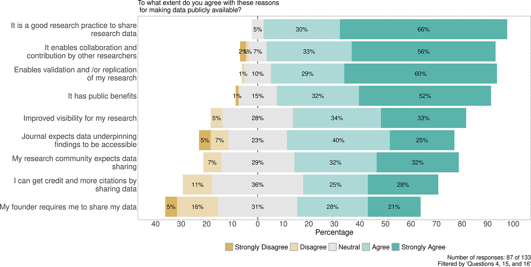 In response to the question (Figure 5) why making data publicly available is important, different motivations were grouped by the level of agreement. Because it is a good research practice 84/87, (96%) respondents Agree (30%) and Strongly Agree (66%). At the same time, 77/87 (89%) respondents considered it important for Enabling collaboration and contribution by other researchers, Agree (33%) and Strongly Agree (56%), and close ratios for Enabling validation and replication (89%) when combining Agree (29%) and Strongly Agree (60%), and Public benefits (84%) when combining Agree (32%) and Strongly Agree (52%). Respondents agree or strongly agree with the options of My funder requires and I can get credit and more citations with 49/87 (56%) and 57/87 (65%), respectively.