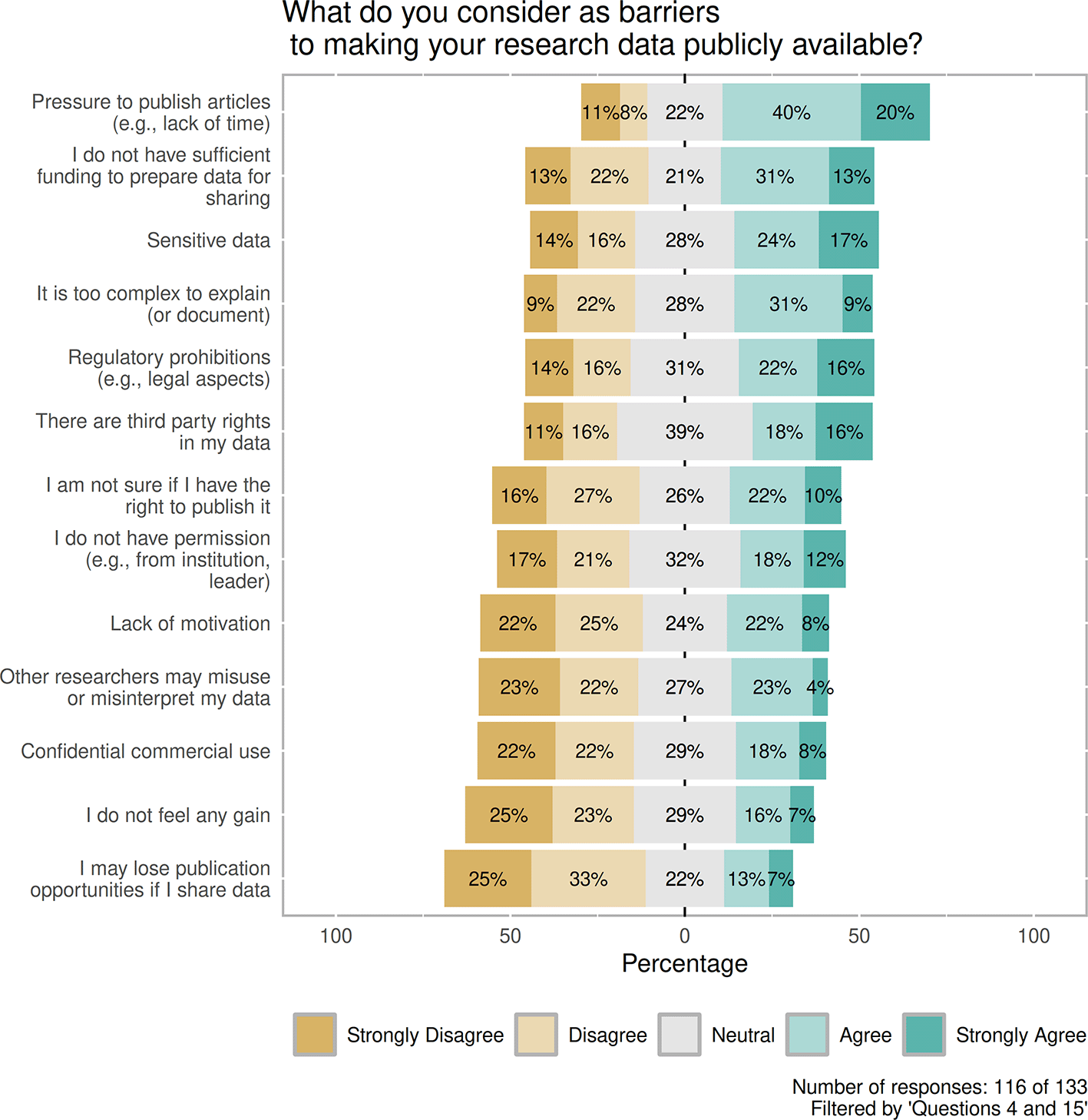 Considering the barriers (Figure 6), respondents were asked to judge 13 predefined reasons that hindered data sharing. Here, the most common reason was the lack of time (i.e., the pressure to publish articles) (70/116, 60%), followed by the lack of sufficient funding that supports data sharing (51/116, 44%), and the sensitive characteristics of data were mentioned in third place (48/116, 41%) with Agree or Strongly Agree. Data complexity, uncertainty about rights to share, and lack of permissions can be considered moderate barriers, with a relatively high ratio of neutral responses, suggesting some level of perplexity. Factors of Losing publication opportunities, Feeling of additional gain, Confidential commercial use or Lack of motivation with a relatively high number of Strongly Disagree and Disagree options (67/116, 58%; 57/116, 48%; 51/116, 44%; and 52/116, 45%) show that these cannot be considered as major barriers.