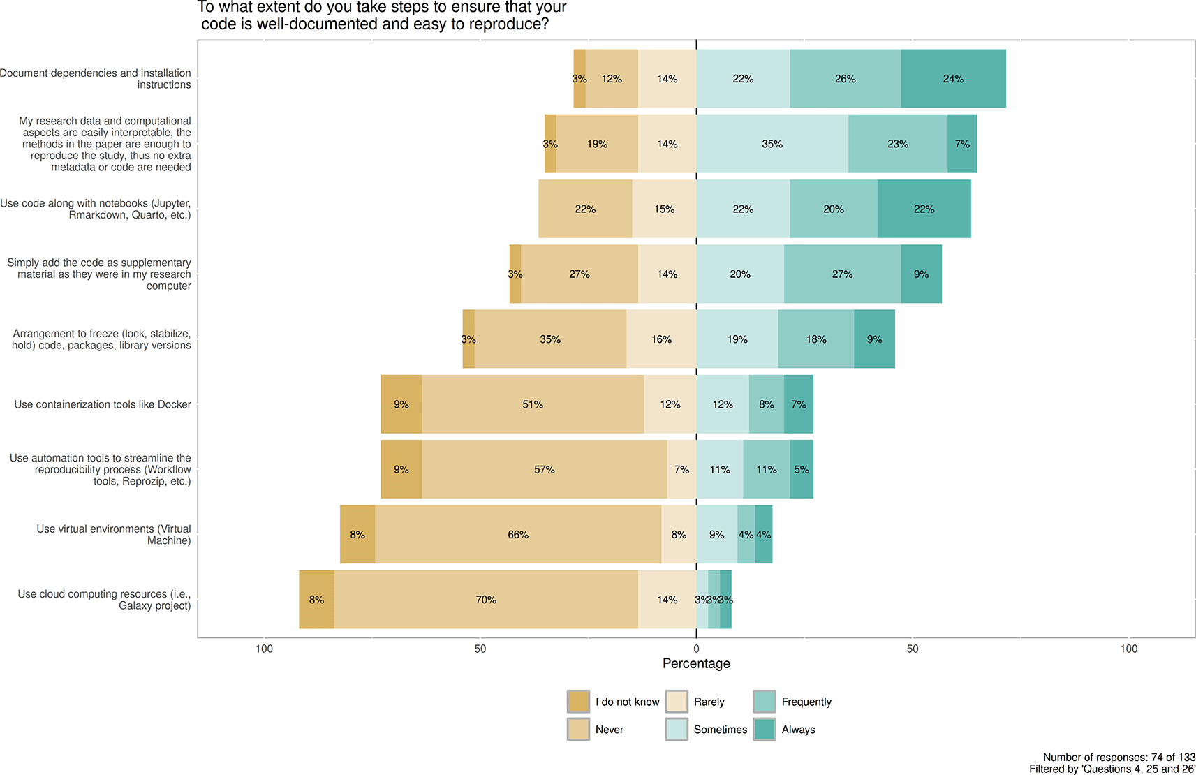 Continuing with the well-documented and easy-to-reproduce characteristics of shared codes (Figure 7), respondents were asked to decide on a Likert scale (using Always, Frequently, Sometimes, Rarely, Never, plus I do not know) about efforts. On the most applied side, Documentation of dependencies and installation instructions (53/74, 72%) for Always, Frequently and Sometimes combined), and Using code along with notebooks (48/74, 65%) for Always, Frequently and Sometimes combined) are marked as applied practices. Respondents who shared code frequently never used cloud computing resources (52/74, 70%), virtual environments (49/74, 66%), automation tools (such as workflow tools or Reprozip (Chirigati et al., 2016)) (42/74, 57%), or containerization tools (such as Docker (Merkel, 2014)) (38/74, 51%).