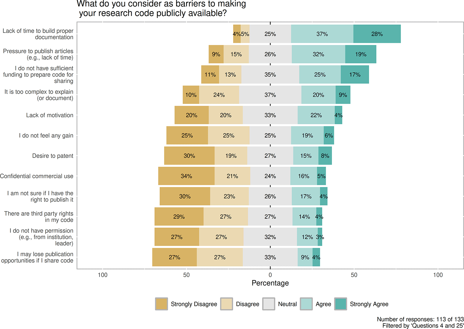 Although respondents were aware of Good research practices, these replies were projected to the subsequent question (Figure 8) about barriers to making research code publicly available. Fully in line with these highlighted free-text opinions, among predefined barriers: the Lack of time to build proper documentation 73/113, 65% (Agree (37%) and Strong Agree (28%)); the Pressure to publish 58/113, 51% (Agree (32%) and Strong Agree (19%)); and insufficient funding to prepare code for sharing 47/113, 42% (Agree (25%) and Strong Agree (17%)) are the most commonly mentioned reasons. The following reasons are not considered barriers, as respondents voted with Disagree and Strongly disagree: I may lose publication opportunities if I share code and I do not have permission both with 61/113, 54% (Disagree (27%) and Strongly disagree (27%)).