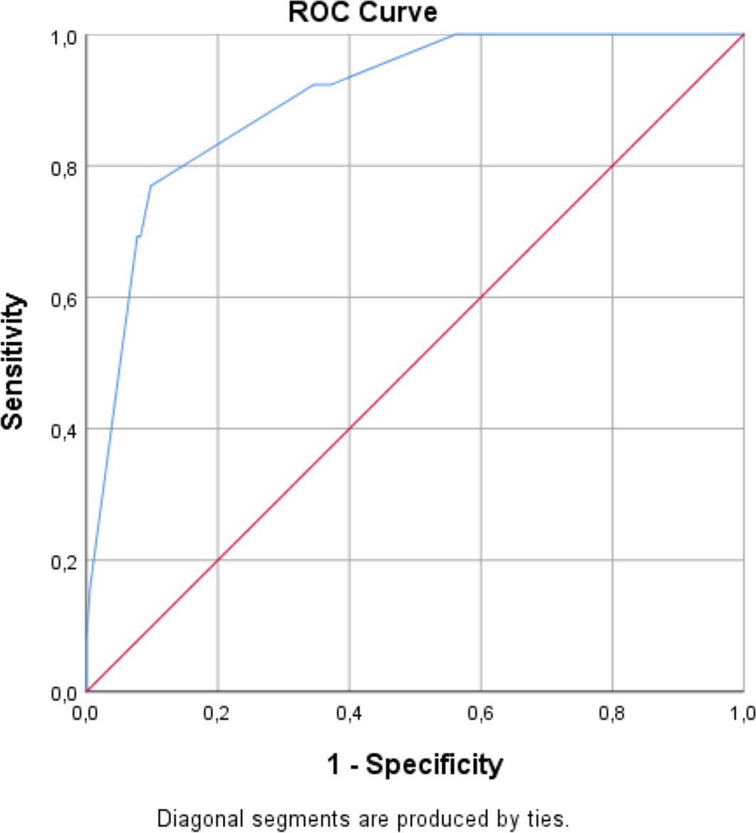 - The area under the ROC curve (AUC) was 0.901 (95% CI: 0.825–0.976, p < 0.001), indicating high accuracy in distinguishing malignant from benign cases.