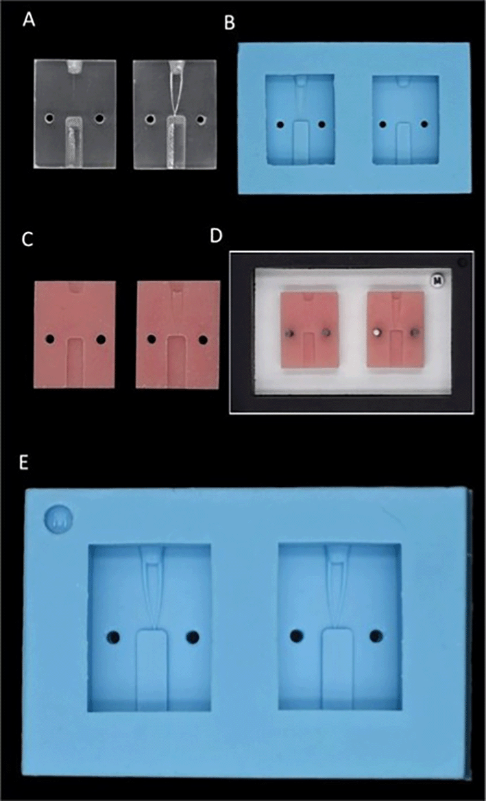 A milling machine was used to mill two canals and an isthmus in plexiglass blocks that were cut to 4 × 3 × 1 cm. The blocks were then positioned in a high-precision CNC machine, which milled the desired root canal anatomy. The initial canal size simulated ISO 15, with the isthmus and half of the simulated pulp chamber were milled into one block, while the counterpart block contained only the remaining pulp chamber part ( Figure 1A). These blocks were molded using rubber duplication material (Ormaduplo, Major Prodotti Dentari, Italy) ( Figure 1B). The molds were filled with self-cured acrylic material, producing three duplicates of the milled blocks ( Figure 1C). The corresponding parts were assembled using screws, and the canals were prepared to a working length of 21 mm using WaveOne Reciprocating Files (Dentsply Sirona, USA) in small, primary, and medium sizes (one model per size). The acrylic models were then secured in a molding setup with positioning pins to ensure precise repositioning ( Figure 1D). These reference models were subsequently duplicated with rubber molding material to create the final test samples ( Figure 1E).