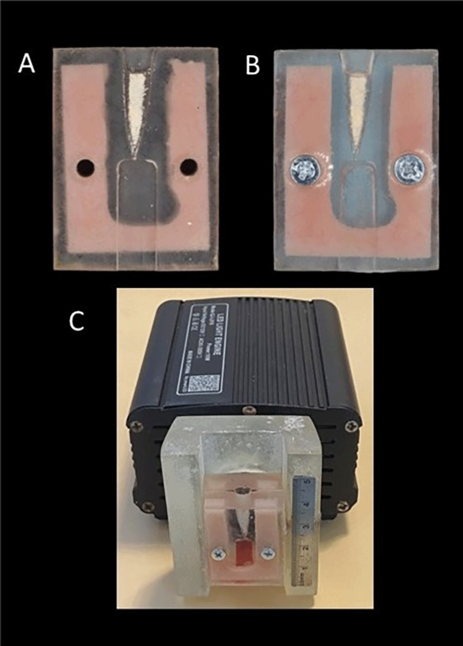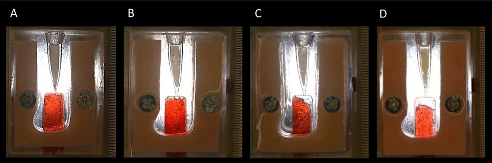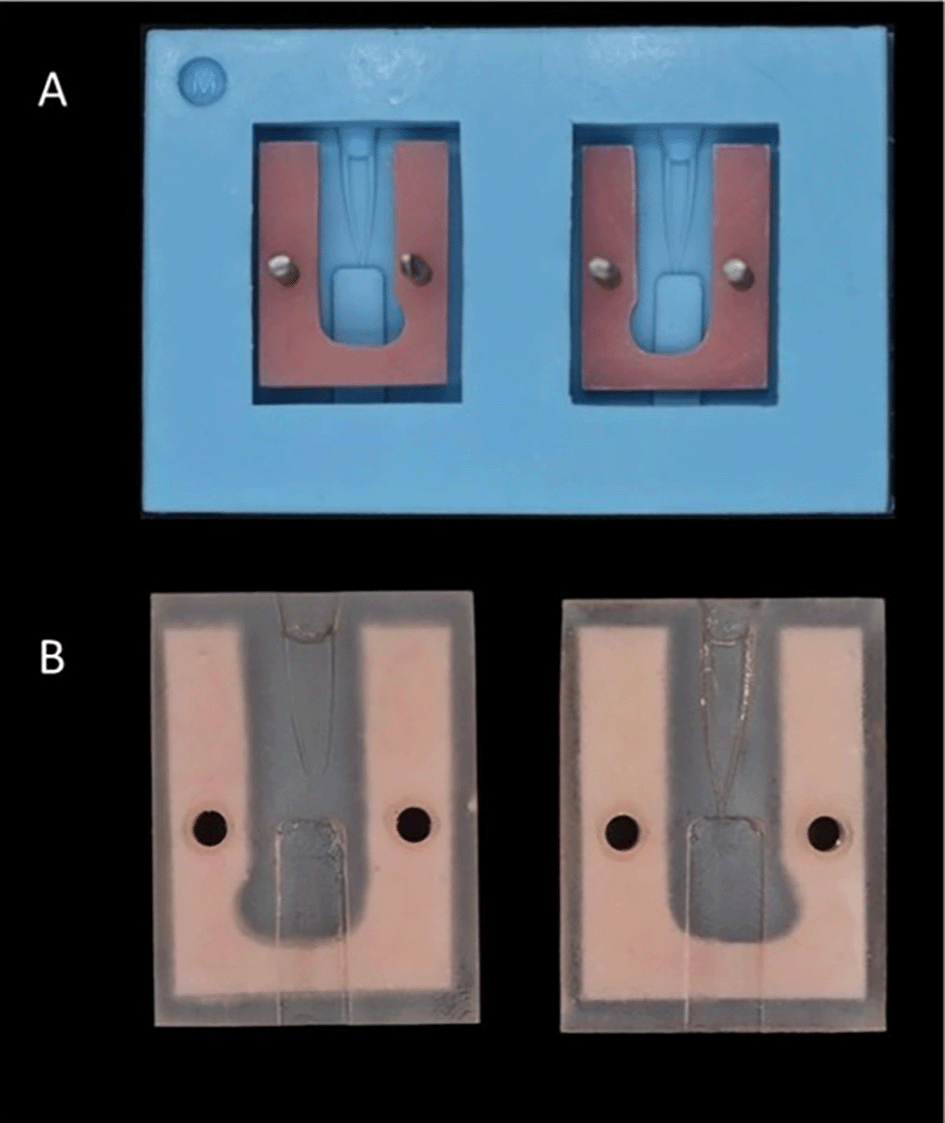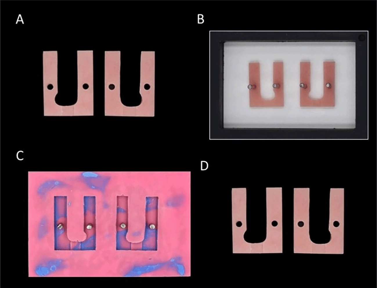 To simulate dentin debris, bovine teeth roots were dry-ground using a carbide bur, producing dentin powder. The powder was mixed with water at a 2:1 volume ratio before application. To prevent leakage and ensure a proper seal, a thin layer of Vaseline was applied to the model’s exterior. The debris sludge was placed in the isthmus region of one model half ( Figure 4A), after which the counterpart was positioned and secured with two 35-mm-long M3 screws ( Figure 4B). The models were stored in water until the experiment commenced.