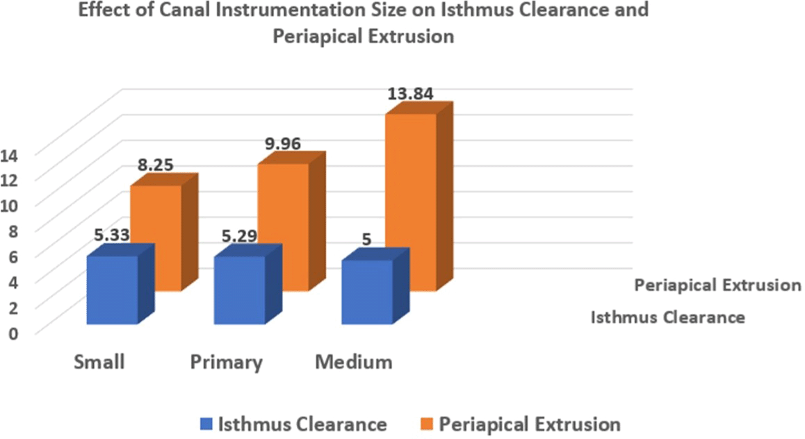 ANOVA analysis was performed to determine the mean values and standard deviations for isthmus clearance and periapical extrusion among different canal sizes ( Table 1). The findings suggested that while isthmus clearance remained relatively consistent across canal sizes, periapical extrusion exhibited a notable increase with larger apical preparation sizes.