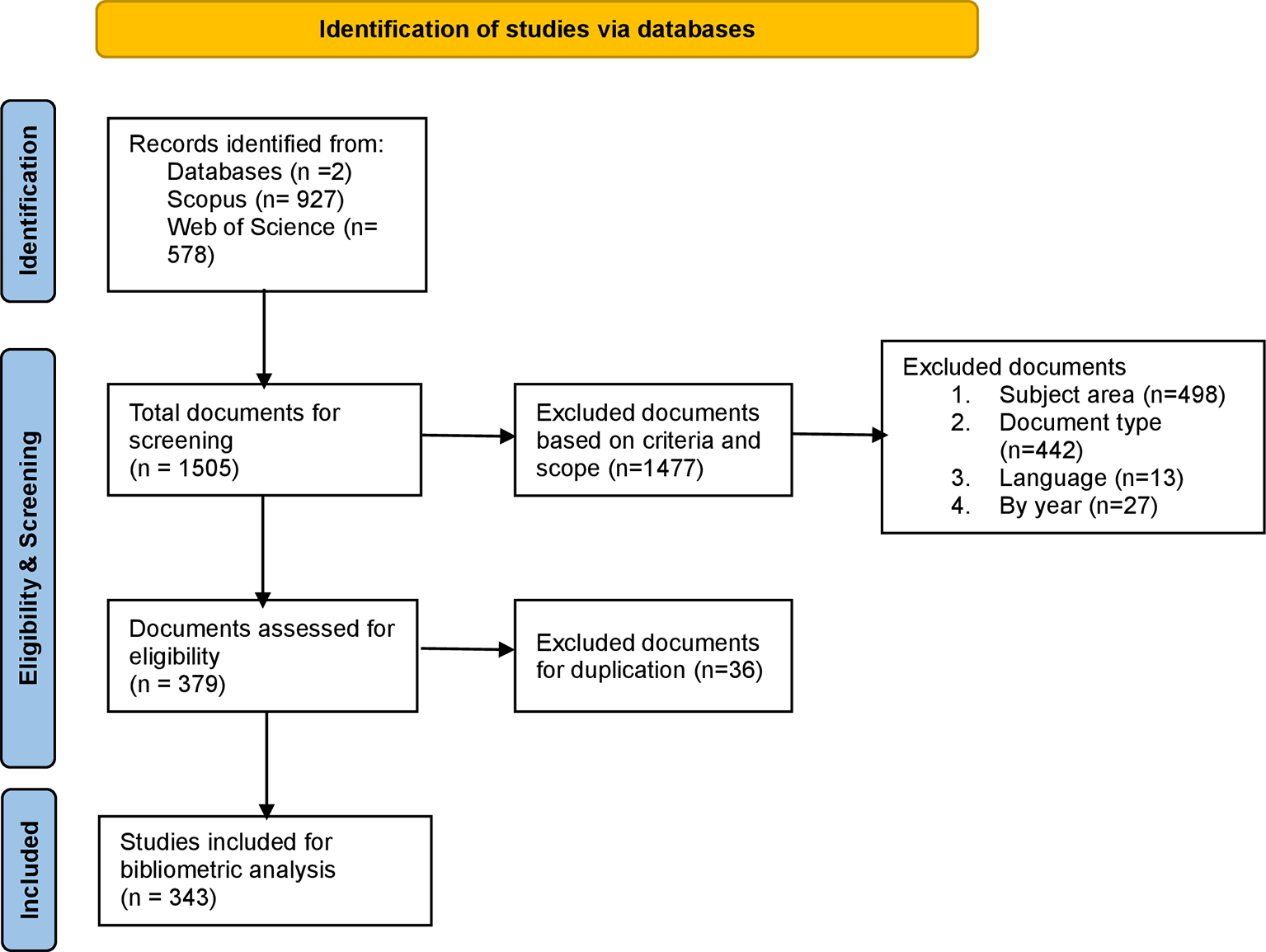 Initially, 927 and 574 research articles were explored from the SCOPUS and WoS databases, respectively. However, in later stages, considering the inclusion and exclusion criteria of the search, a total of 343 efficient articles were used for the scientometric analysis using Vos Viewers and R-studio. Different types of software are available for conducting bibliometric analysis, such as CiteSpace, Gephi, BiblioShiny, and Vosviewer; however, this research utilized a free, open-source viewer for analysis. It is used to construct and visualize bibliometric networks from almost all databases, such as SCOPUS, WOS, Dimensions, Google Scholar, and PubMed. Vosviewer software is known for its user-friendly interface and ability to generate informative visualization structures (Kakkar & Sachdeva, 2025).