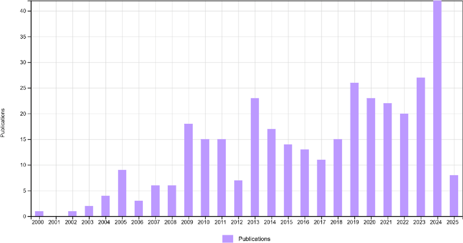Bar chart showing the yearly distribution of publications on workplace coaching from 2000 to 2025, highlighting trends and growth patterns in the academic literature.