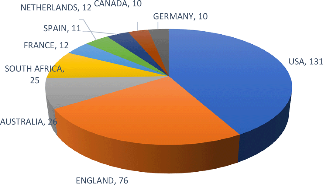 The top 10 prominent countries in this study are shown in Figure 4. The United States of America is the most prominent country, with 131 documents, followed by England (76) and Australia (26). Authors from these countries have initiated the concepts of leadership, executive, and employee coaching as foundational and review papers. (Day, 2000; Feldman & Lankau, 2005; Heslin et al., 2006).