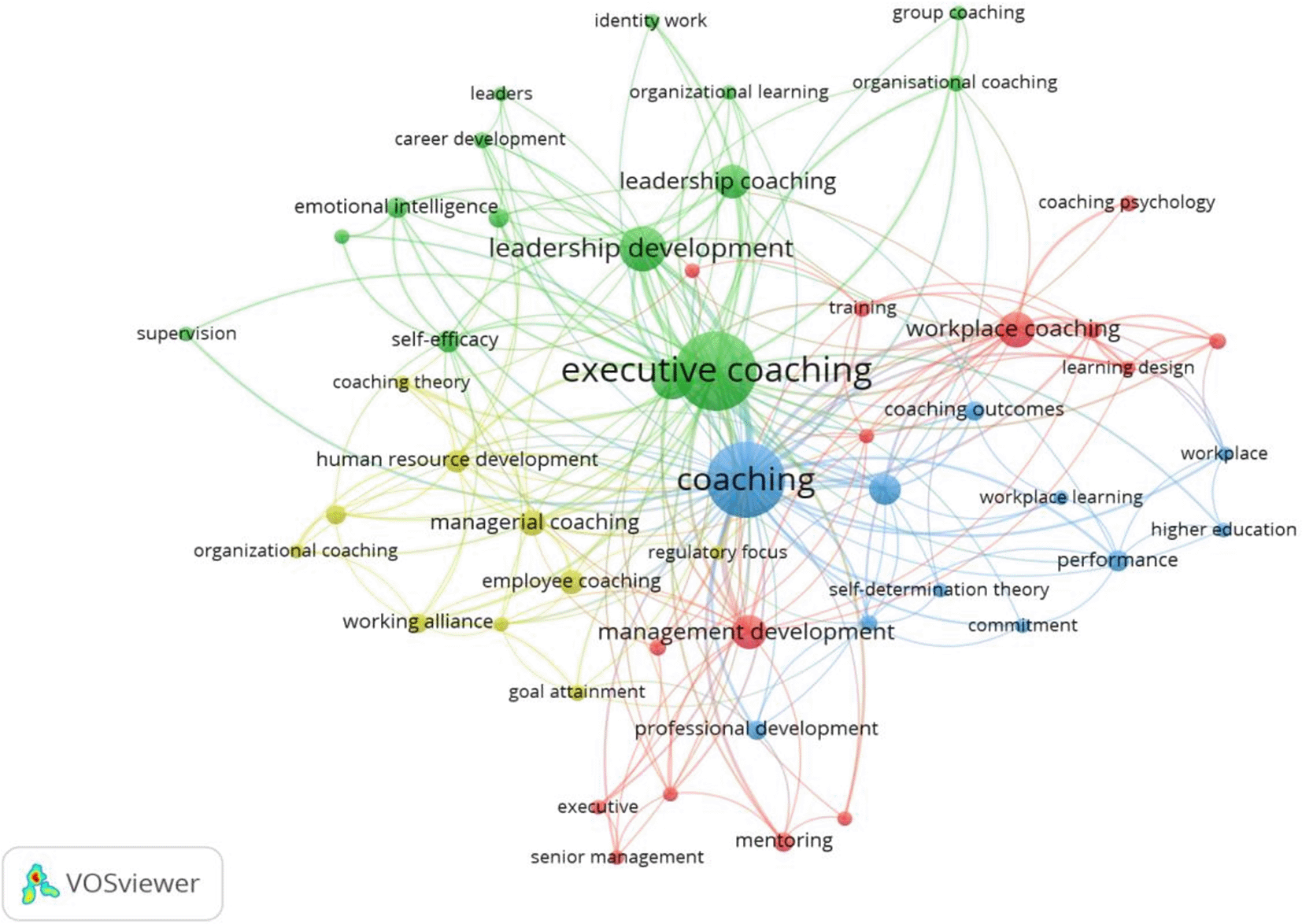This study leveraged the author’s logical understanding, theoretical integration, and descriptive acumen to evaluate the clusters in workplace coaching research. Four clusters were explored and themed, based on the foundational research ideas identified in. Figures 5 and 6 show the co-occurrence network and overlay visualizations, respectively.