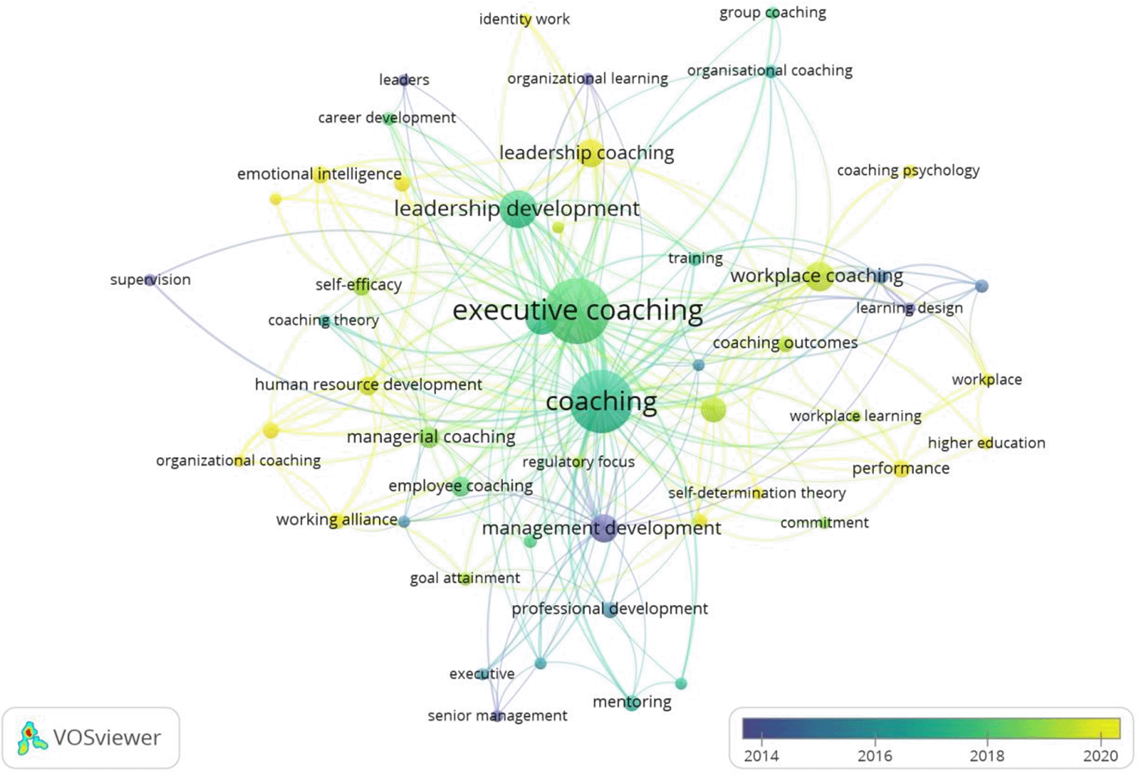 Temporal overlay visualization of keyword co-occurrence networks, illustrating shifts in research focus and the emergence of new themes in workplace coaching over time.
