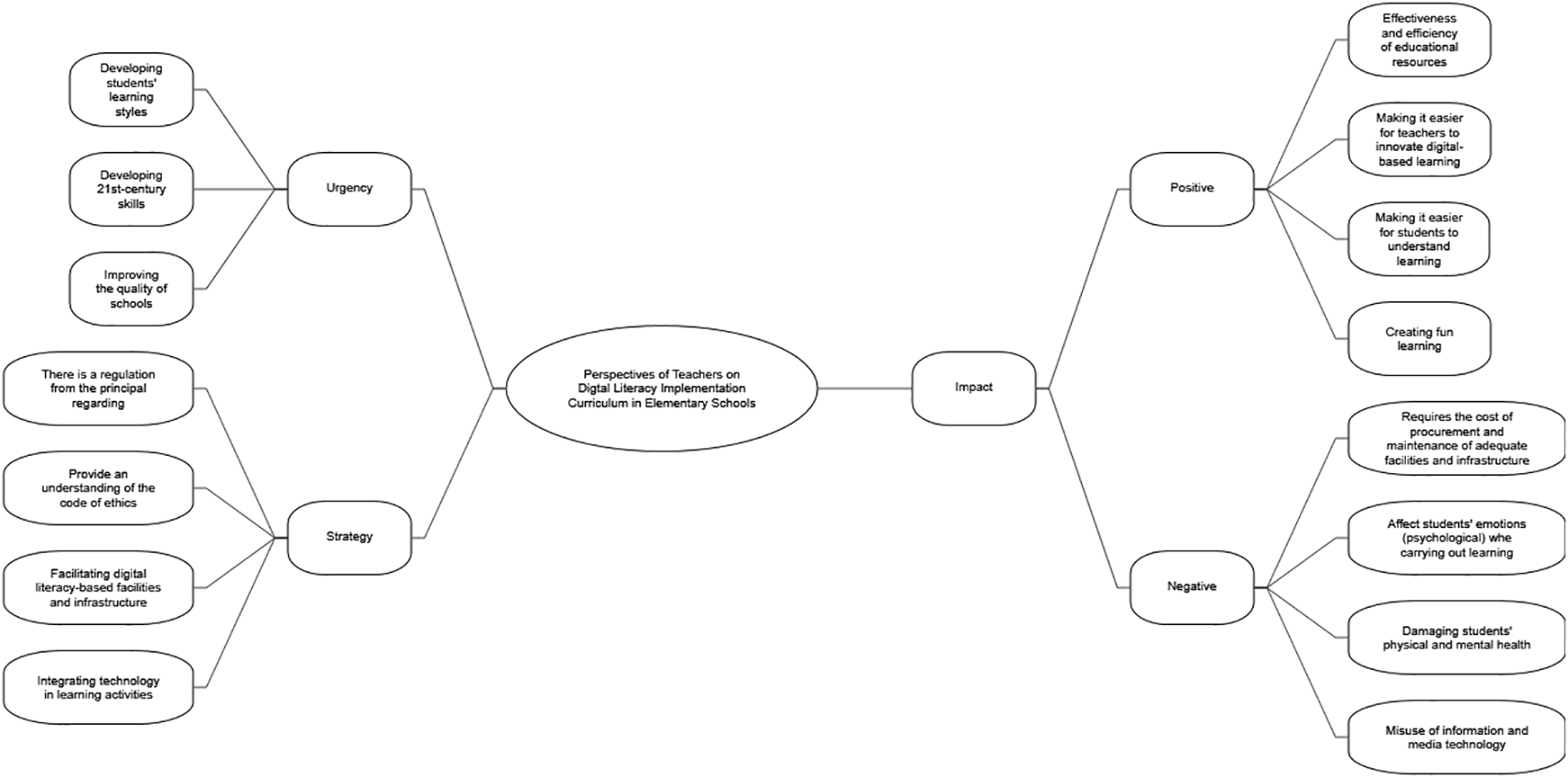 Thematic analysis revealed three main themes, namely (1) the urgency of implementing digital literacy in the curriculum in elementary schools, 2) teachers’ strategies in implementing digital literacy in the curriculum in elementary schools, and 3) the positive and negative impacts of the implementation of digital literacy in the curriculum in elementary schools. All themes are summarized in Figure 1.