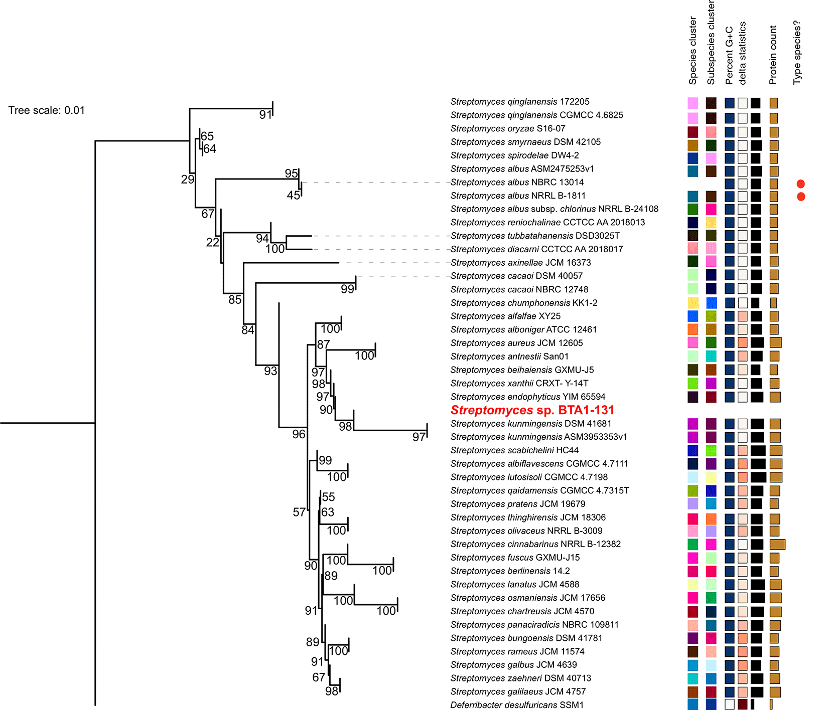 As aforementioned, the strain BTA 1-131 was previously identified by sequencing the 16S rRNA gene and is closely related to S. kunmingensis NBRC 14463 with the sequence similarity of 98.4%. Indeed, the results of TYGS species identification suggested a potential novel Streptomyces species for the strain BTA 1-131, as indicated by the dDDH value below the threshold for classification as the same species as the nearest strain, S. kunmingensis DSM 41681 (<70%) ( Figure 3). Moreover, the ANI score between the BTA 1-131 genome assembly and S. kunmingensis DSM 41681 was 89.15%.