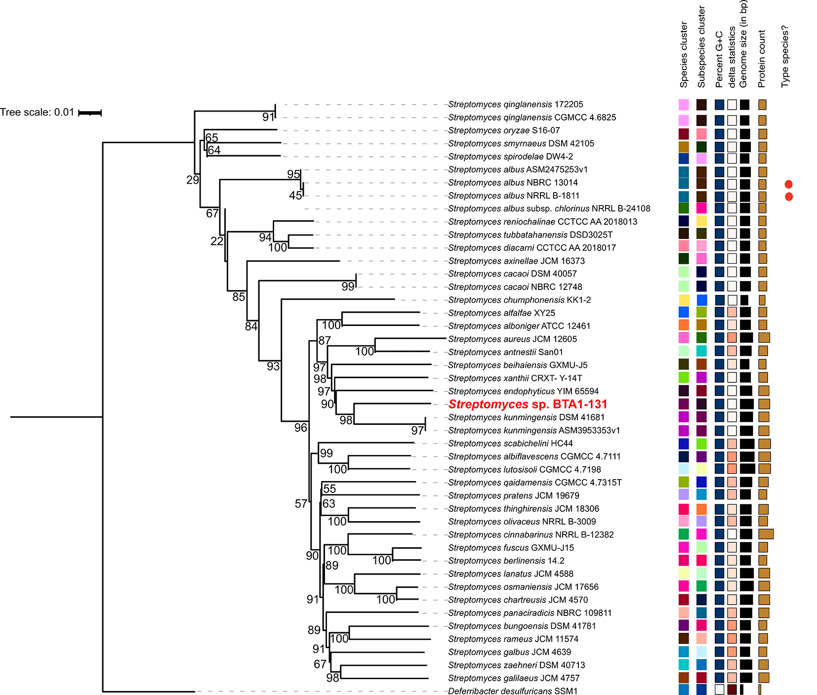 As aforementioned, the strain BTA 1-131 was previously identified by sequencing the 16S rRNA gene and is closely related to S. kunmingensis NBRC 14463 with the sequence similarity of 98.4%. Indeed, the results of TYGS species identification suggested a potential novel Streptomyces species for the strain BTA 1-131, as indicated by the dDDH value below the threshold for classification as the same species as the nearest strain, S. kunmingensis DSM 41681 (<70%) ( Figure 3). Moreover, the ANI score between the BTA 1-131 genome assembly and S. kunmingensis DSM 41681 was 89.15%.