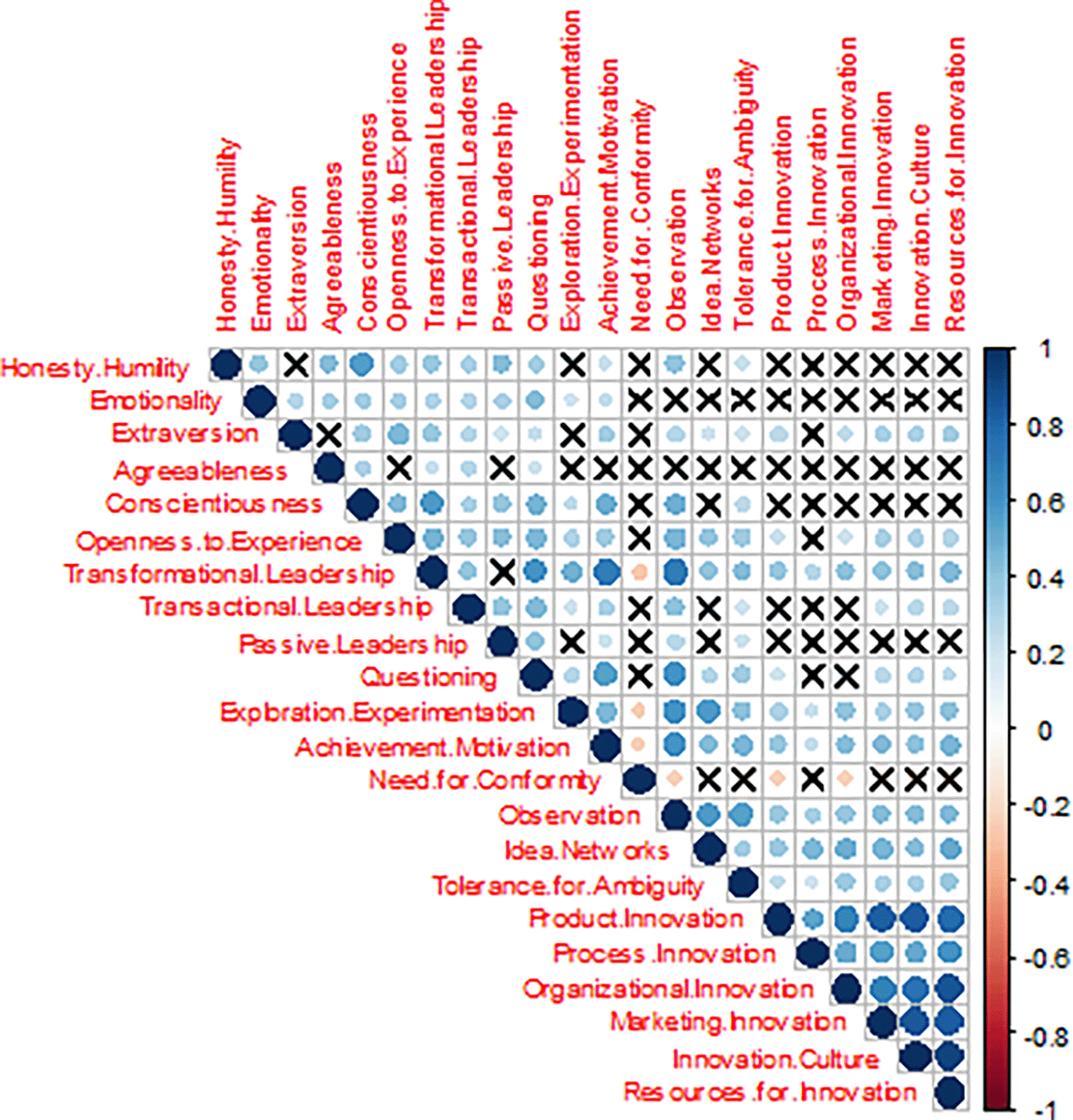 Figure 2 shows the pair-wise (Pearson) correlations. The correlation structure illustration uses a blue-white-red diverging color scale, where positive correlations are represented by blue marbles and negative correlations by red marbles. The intensity of the color and the marble size are both proportional to the correlation values. Non-significant correlations are marked with an “X.”