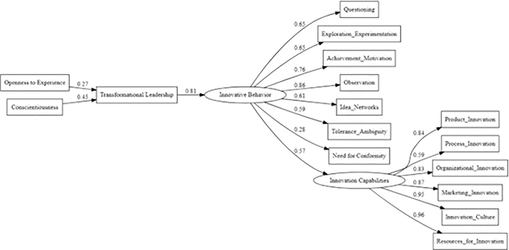 To examine the hypothesized relationships, this study specified a confirmatory path analysis model in which Openness to Experience and Conscientiousness predicted Transformational Leadership, which in turn predicted Innovative Behavior. Innovative Behavior was modeled as a latent construct indicated by its seven subscales, and subsequently predicted Innovation Capabilities, modeled as a latent construct indicated by its six dimensions. This SEM model is illustrated in Figure 3.