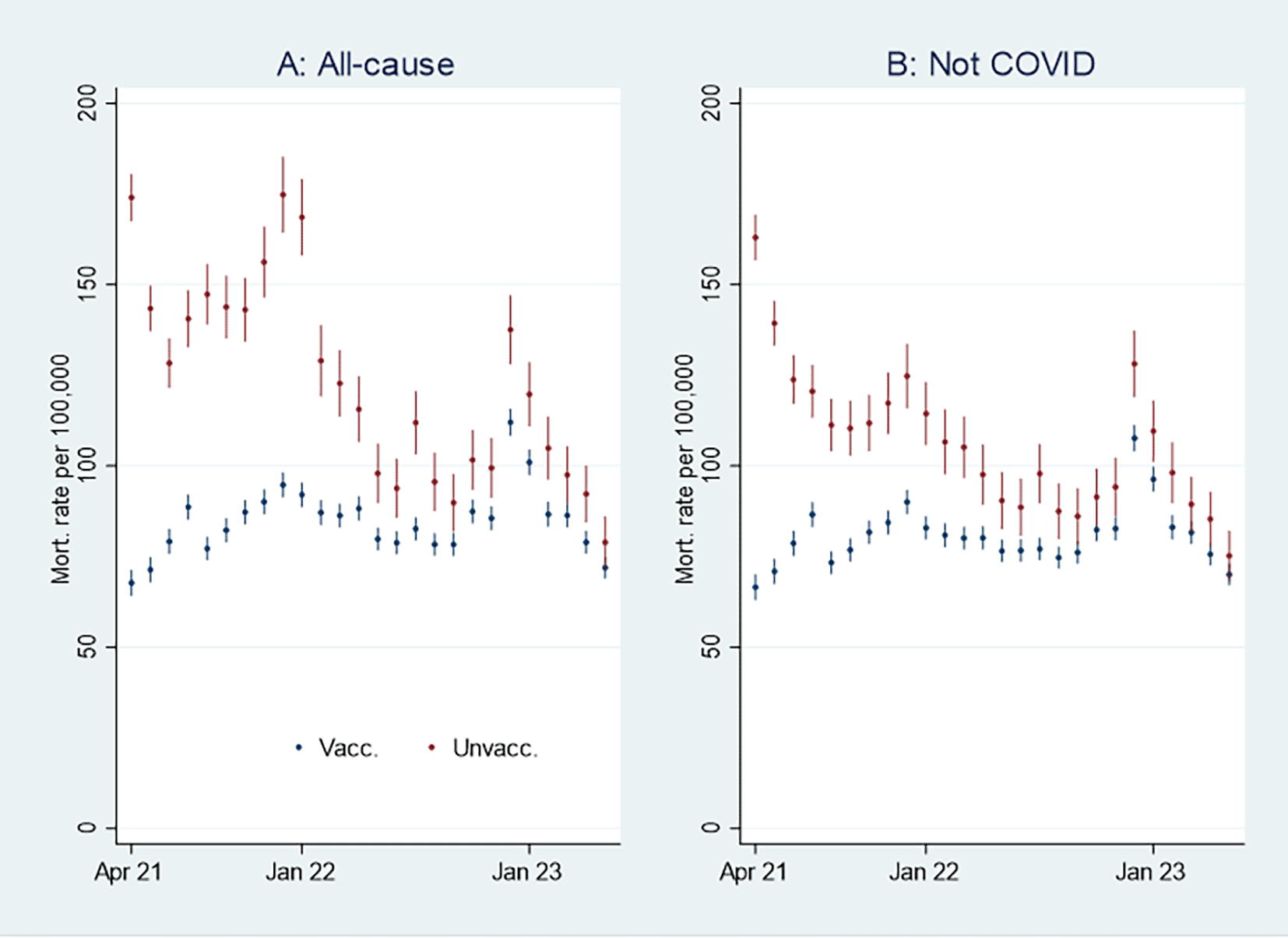 Figure 1A shows that the monthly all-cause mortality rate, particularly at the beginning of the period, was higher among unvaccinated (marked in red) than vaccinated (marked in blue). The rate decreased among the unvaccinated, but among the vaccinated, it was relatively stable or had a slight increase. Consequently, the all-cause mortality among unvaccinated and vaccinated was almost tangent at the end of the period.