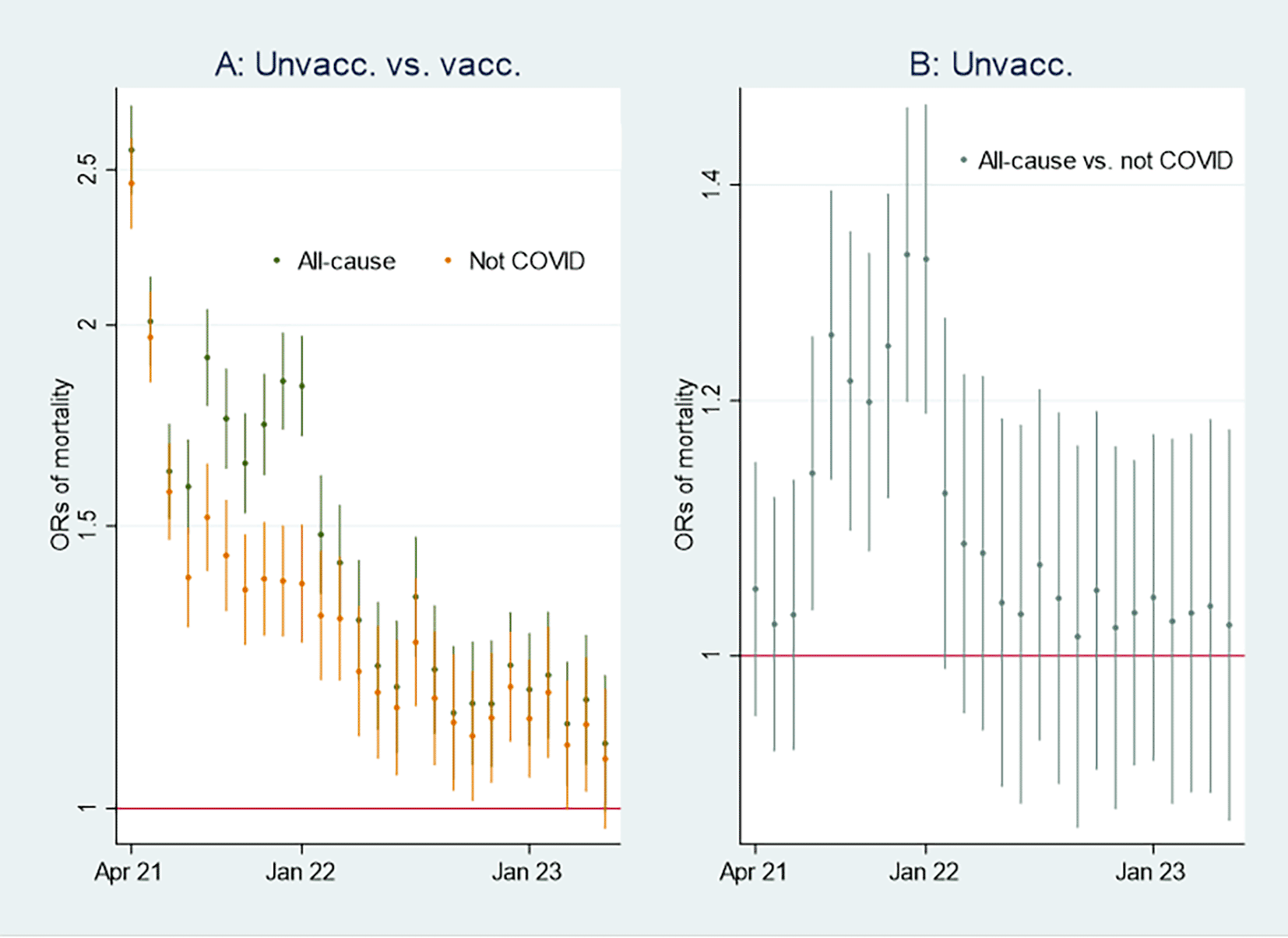 Figure 2A shows ORs of all-cause mortality and mortality not involving COVID-19 among unvaccinated compared to vaccinated as a reference group [1]. At the beginning of the period, the ORs of all-cause mortality (marked in green) among unvaccinated were approximately between 2 and 2.5 compared to vaccinated (significant at the 95% CIs), and mortality not involving COVID-19 (marked in orange) shows a similar pattern. In parallel, Figure 3 shows that the mortality rate involving COVID-19 was low at the beginning of the period for both vaccinated and unvaccinated (A and B are identical, except for different scaling). Therefore, I conclude that unvaccinated had between 2 and 2.5 times higher ORs of all-cause mortality and mortality not involving COVID-19 compared to vaccinated at the beginning of the period, largely due to inferior health at the outset, and not vaccine protection since the overall mortality involving COVID-19 during that period was low. The argument is grounded in the assumption that the vaccine unlikely protects against mortality not involving COVID-19.23 That is, if close to zero people died from COVID-19, I cannot see any logical reason why the mortality pattern observed at the beginning of the period has another explanation than unvaccinated having inferior health at the outset.