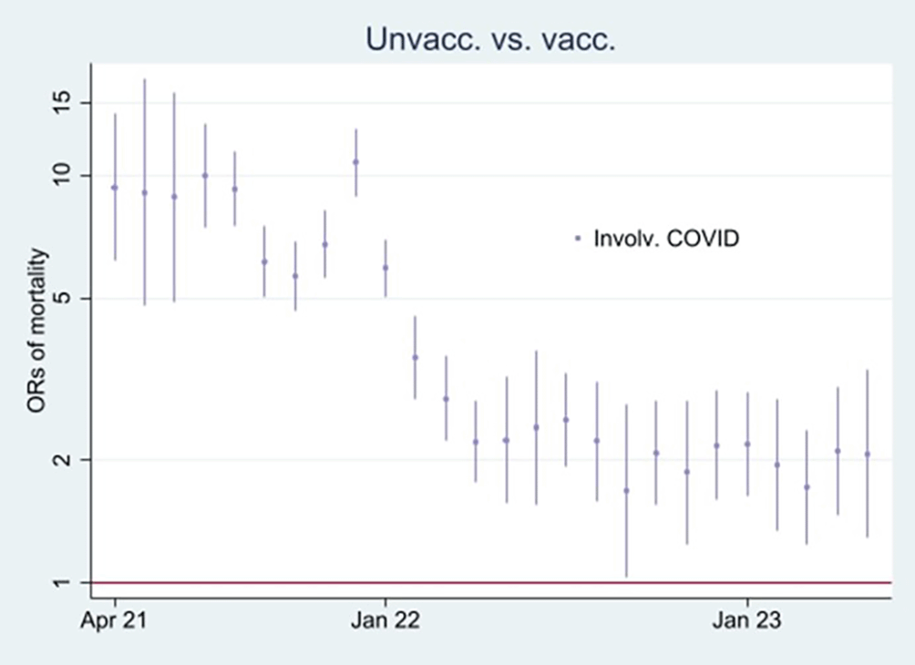 As the study found that COVID-19 vaccination may have prevented mortality, it contributes to and aligns with other research showing similar effects.1016 As it found that the vaccine protection was temporal, it further contributes to and aligns with other research showing that it declines.17 Finally, as the study indicated that COVID-19 vaccination may have increased mortality in a longer perspective, it contributes to and aligns with other research that also shows the intervention can have adverse effects2427 and increase mortality,28 including from the virus.29,30