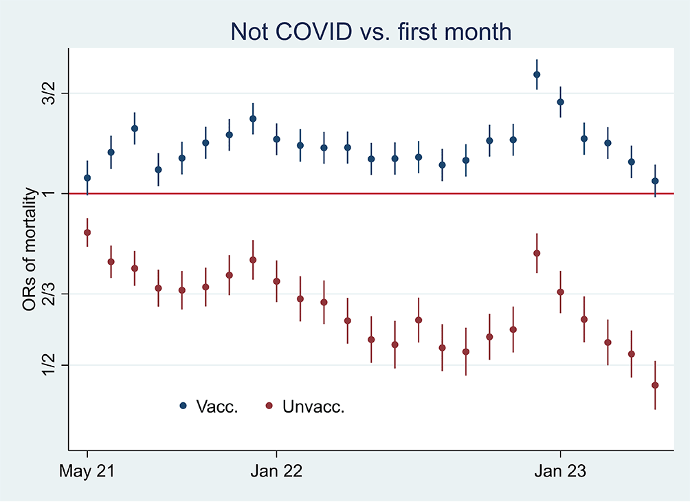 First, I found that all-cause mortality among unvaccinated was higher than among vaccinated. But, as the pattern was similar concerning mortality not involving COVID-19, the discrepancy can be attributed mainly to unvaccinated having inferior health at the outset. There were nonetheless indications of significant protection for vaccinated between July 21 and Jan 22. In the absence of control variables as a means to compare non-randomized groups, I reached that conclusion by contrasting all-cause mortality with mortality not involving COVID-19. However, while mortality not involving COVID-19 decreased among unvaccinated compared to the first observation month, it remained high among vaccinated, indicating a relative increase.