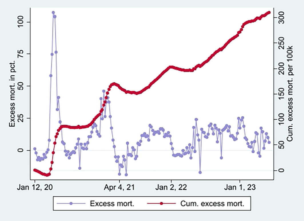 First, I estimated age-standardized all-cause mortality among vaccinated and unvaccinated ten years and older, covering 26 months from Apr 21 to May 23. Then, I estimated mortality not involving COVID-19, and finally, I contrasted the calculations.