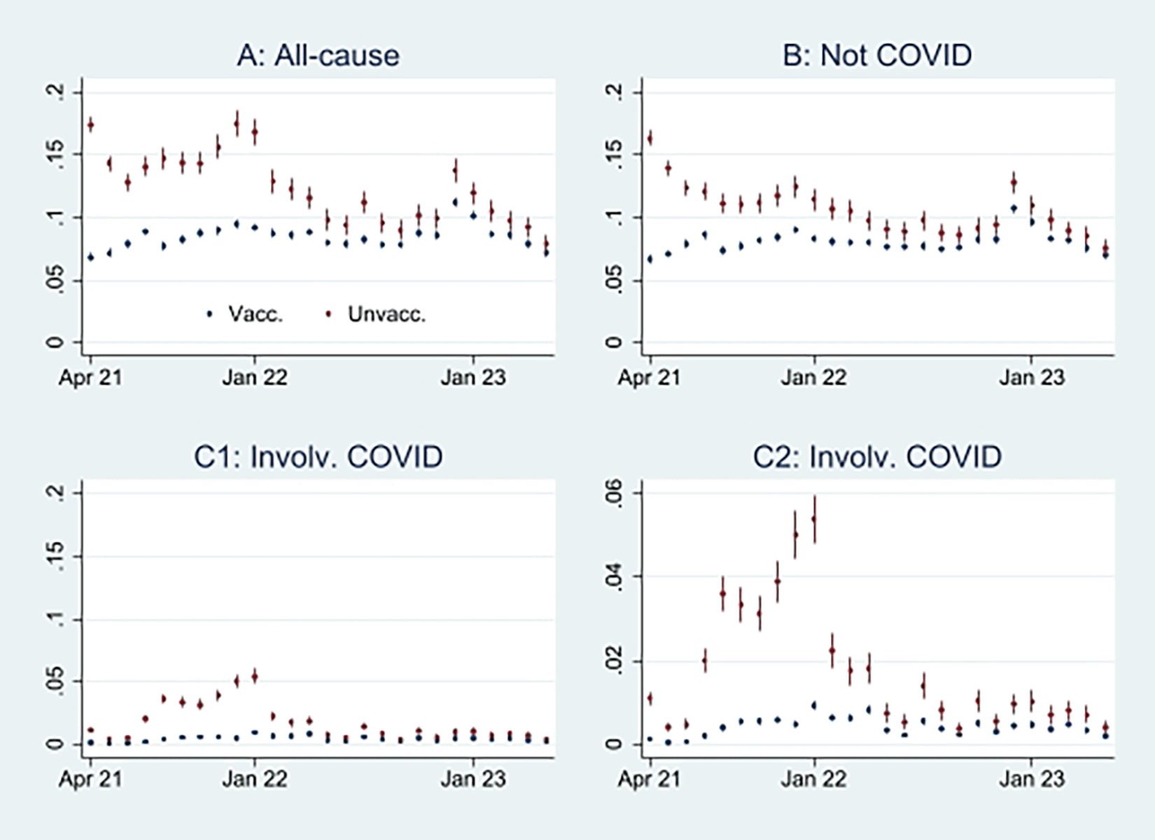 Figure 1A shows that the all-cause mortality probability, particularly at the beginning of the period, was higher among unvaccinated than vaccinated. The mortality decreased among the unvaccinated, but among the vaccinated, it was relatively stable or had a slight increase. Consequently, the mortality among unvaccinated and vaccinated almost was tangent at the end of the period.