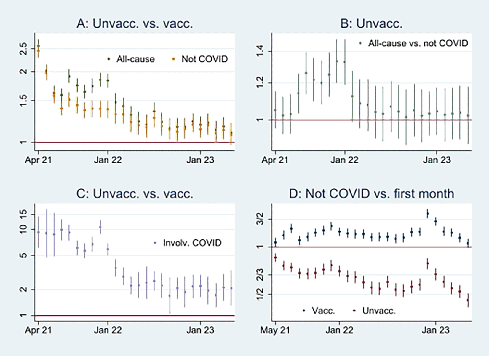 Figure 2D shows that while mortality not involving COVID-19 decreased among unvaccinated compared to the first observation month, it was high among vaccinated [4]. The results reflect mortality probabilities in Figure 1B, which were almost tangent at the end of the period. Also, they reflect the declining ORs of unvaccinated reported in Figure 2A, taking a non-significant value of a little over 1 at the end (95% CI). Hence, the data show a relatively high and relative increase in mortality not involving COVID-19 among vaccinated. An interpretation is that vaccination, despite temporary protection, increased mortality.16 Strengthening the interpretation was relatively high mortality among vaccinated not involving COVID-19 counterintuitively following periods of excess mortality ( Figure 3) [5]. Further strengthening the interpretation was the relatively high mortality rate not involving COVID-19 among the vaccinated corresponding with the excess mortality rate during the same period (ibid.) [6].