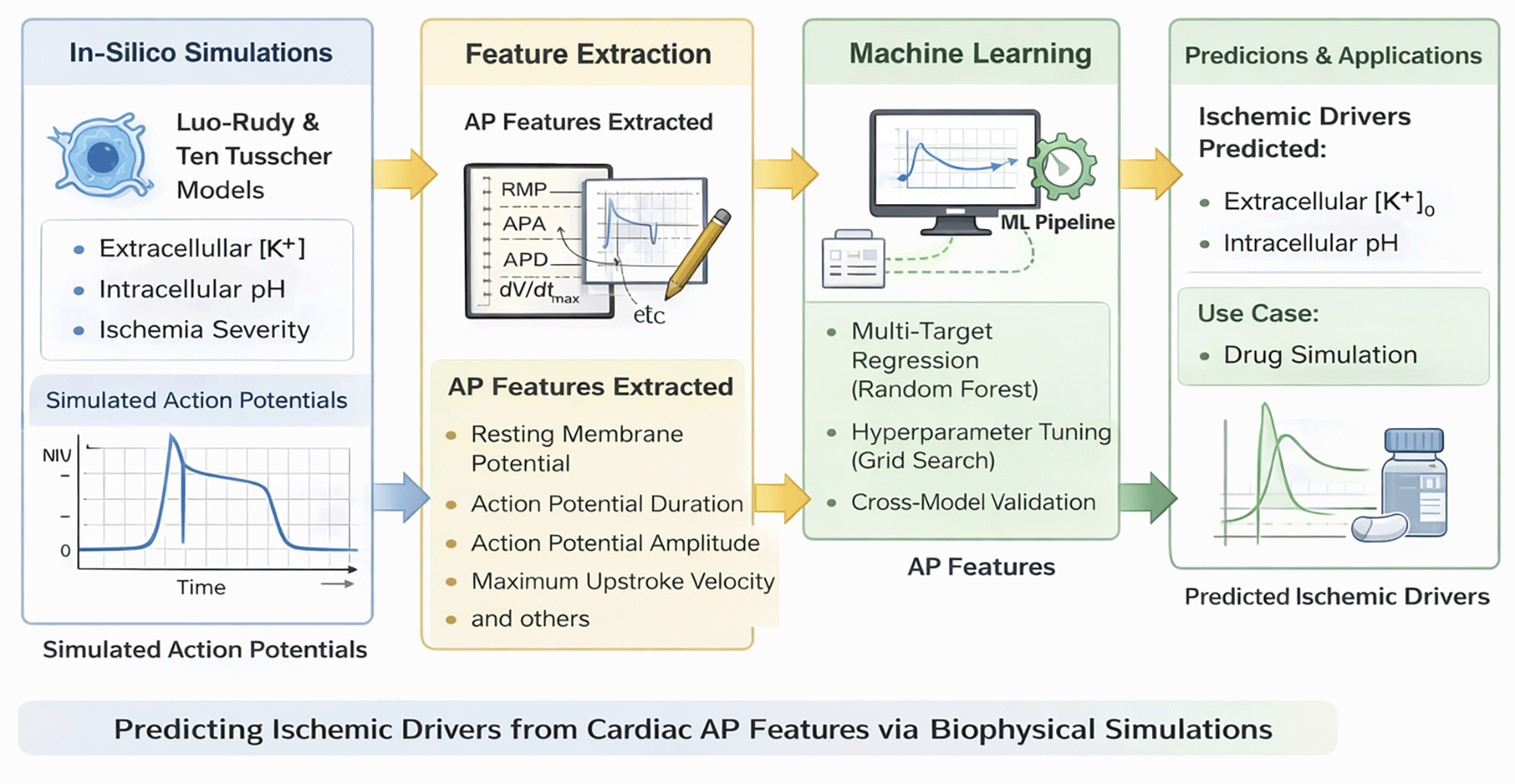 Limitations of this study include the use of simplified cell models and the exclusion of other ischemic contributors like mechanical stretch, sympathetic stimulation, or reactive oxygen species. While our framework demonstrates strong predictive accuracy in silico, it has not yet been tested against experimental data. A clear next step is validation against electrophysiological recordings in ischemic cardiomyocytes, either through patch-clamp experiments or extracellular field potential measurements in animal ischemia models. Such experimental validation would not only strengthen biological plausibility but also provide critical insight into the translational robustness of the approach.