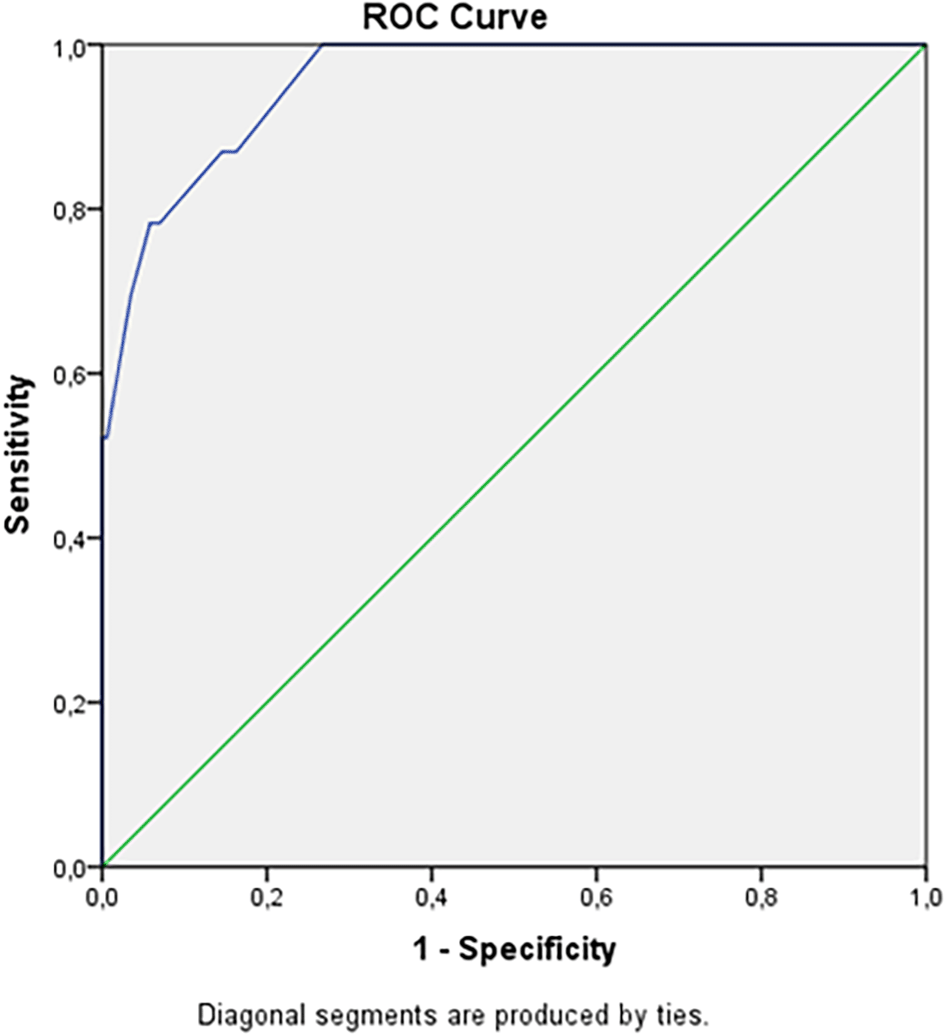 Our analysis showed that the PRE-PAN score had an AUC of 0.955 (p < 0.001; 95% interval confidence, 0.921 – 0.989). A score > 5.75 had a sensitivity of 87% and specificity of 85.5%, which is comparable to previously published results.9