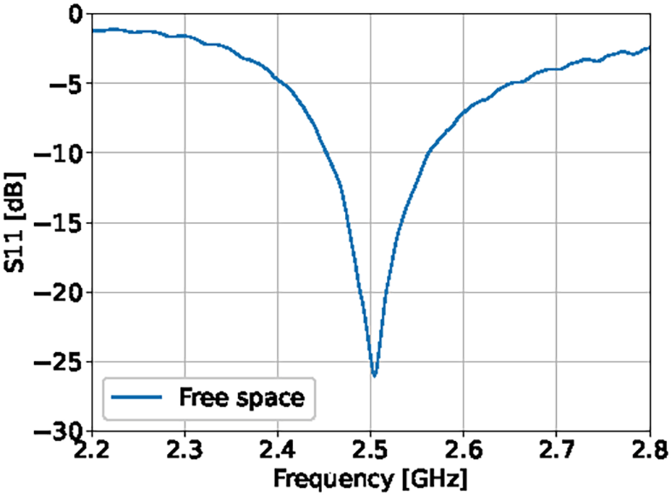 The applicator antenna was designed to operate within the 2.45 GHz ISM band and provides a reduced thermal footprint in simplified human body models composed of layers representing skin, fat, and muscle tissues. The implemented antenna consists of a modified folded dipole design with a ground plane, along with a grounded coplanar waveguide manufactured on both faces of a dielectric substrate that supports the reflector and connection to a coaxial cable. The design and validation of the applicator antenna used during the experiments are detailed in.21 Figure 1 shows the magnitude of the S11 parameter of the applicator antenna in free-space conditions. Its resonance frequency is observed to be 2.5041 GHz. However, since the antenna was designed to operate in the presence of the human body, its resonance and impedance performance are expected to change with respect to free-space conditions.