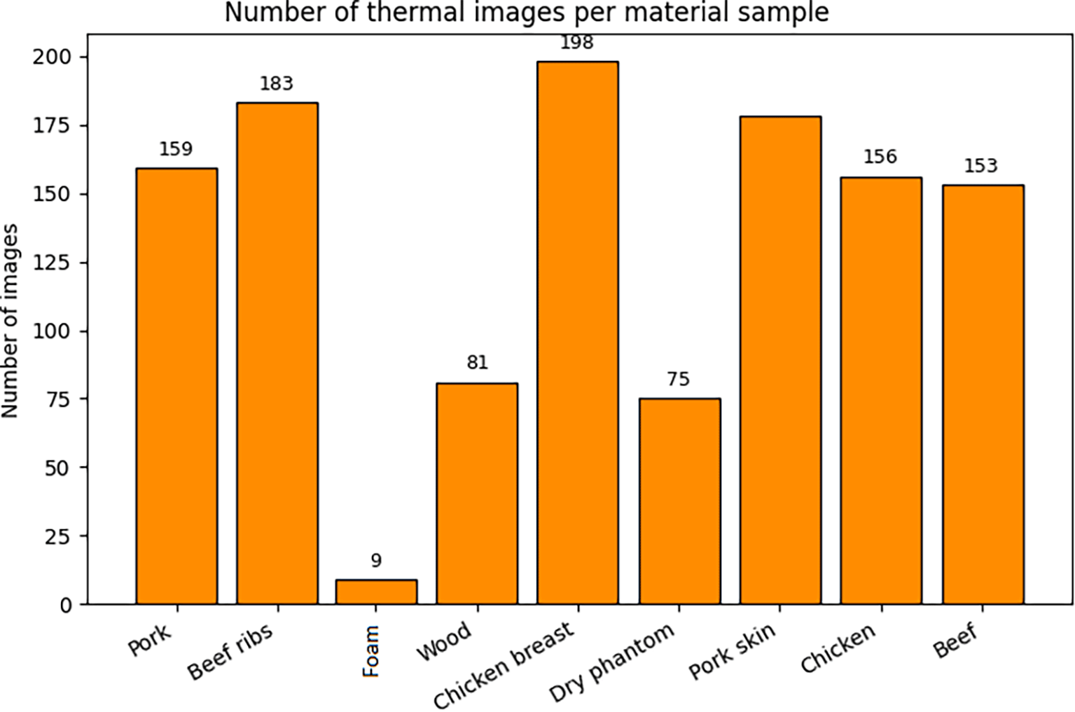 These differences in thermal response among materials motivated the inclusion of both hydrated and dry specimens in the database, providing a diverse set of heating profiles for subsequent image acquisition and model training. All samples were prepared in blocks measuring approximately 5 cm × 5 cm with a depth of 6 cm to maintain comparable volumes between categories, although the organic tissues naturally exhibited heterogeneity due to the type of cut and the uneven distribution of fat. In total, the initial database comprises 1,200 thermal images for each resolution (3,600 total images) and is distributed as follows: 159 images of pork, 183 of beef ribs, 9 of foam, 81 of wood, 198 of chicken breast, 81 of phantom, 180 of pork skin, 156 of chicken thigh, and 153 of beef.