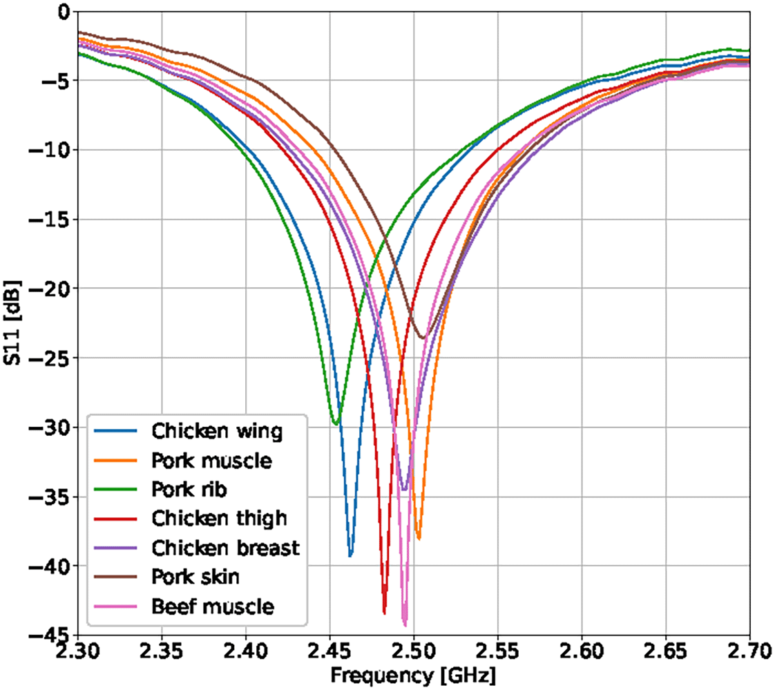 Figure 2 presents the S11 parameter when the antenna is close to different biological tissues derived from chicken, pork, and beef. The greatest variation in resonance frequency and bandwidth location is observed in the presence of bone tissue (see the curves corresponding to the chicken wing in green and the pork rib in blue). However, a shared bandwidth of approximately 75 MHz exists in all the analyzed cases. Within this interval, a center frequency of 2.5 GHz was selected for the RF signal generator, at which the antenna exhibits a minimum return loss of −13 dB or lower for all biological tissues, maintaining a constant distance of 5 mm between the antenna and the tissue. This frequency shift arises from the alteration of the near-field distribution caused by the presence of materials with dielectric permittivity different from that of air—a phenomenon previously exploited by other authors to measure dielectric property variations and characterize biological tissues.22,23