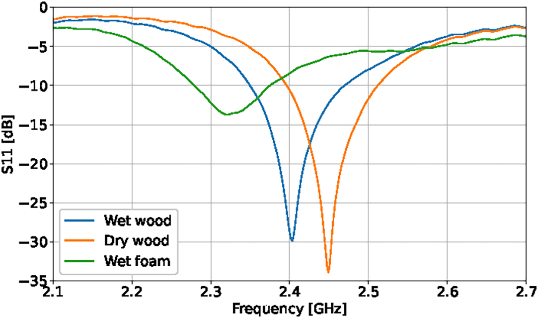 In cases involving inert samples, lower coupling magnitudes were observed, along with significant variations in the resonance frequency and bandwidth. Consequently, it was necessary to adjust the signal generator frequency during these measurements to ensure effective RF energy transfer to the material. The tests conducted with these inert materials confirmed the critical role of water content in materials or tissues to achieve proper antenna coupling, as illustrated in Figure 3 for the cases using dry wood (orange curve) and wet wood (blue curve).