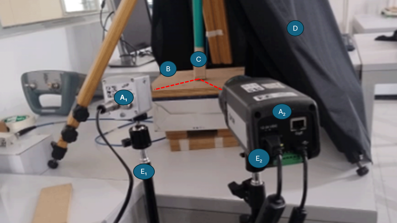 In all acquisitions, the emissivity of the thermal cameras was fixed at 0.98, a value representative of organic tissues and suitable for most biological surfaces with minimal reflectivity. Maintaining this constant emissivity ensured consistent radiometric calibration across materials and camera configurations. Although inert samples exhibit slightly lower emissivity values, adopting a uniform setting avoided introducing correction factors that could bias the comparative thermal response analysis. Figure 5 shows the spatial arrangement used during data acquisition. The labeled elements (A1–A2 and E1–E2) correspond to the thermal cameras and their respective tripods, aligned according to the specified angles and distances. This configuration ensured consistent optical geometry and minimized parallax effects across different camera setups.