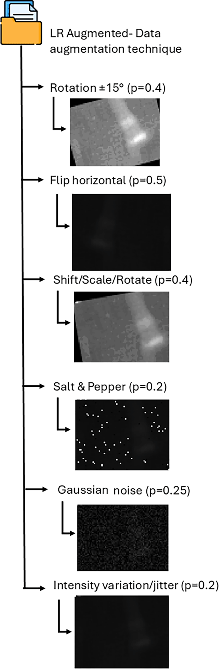 The 200 HR images were subsequently down sampled to MR and subjected to moderate augmentations to simulate more realistic acquisition variability while maintaining a balanced representation of features. Transformations for MR images included rotations within ±10° (p = 0.25), horizontal flips (p = 0.5), mild shift, scale, and rotation adjustments (p = 0.2), and light Gaussian noise (p = 0.1). These augmentations introduced controlled variability while preserving the structural and thermal patterns necessary for downstream analysis. For LR images, which simulate low-quality conditions typical of resource-constrained or degraded sensors, more aggressive augmentations were applied. These included rotations within ±15° (p = 0.4), horizontal flips (p = 0.5), combined shift/scale/rotation (p = 0.4), salt-and-pepper noise (p = 0.2), Gaussian thermal noise (p = 0.25), and intensity jitter (p = 0.2). This set of transformations enabled the simulation of sensor noise, geometric distortions, and photometric inconsistencies often encountered in low-resolution imaging.19,28