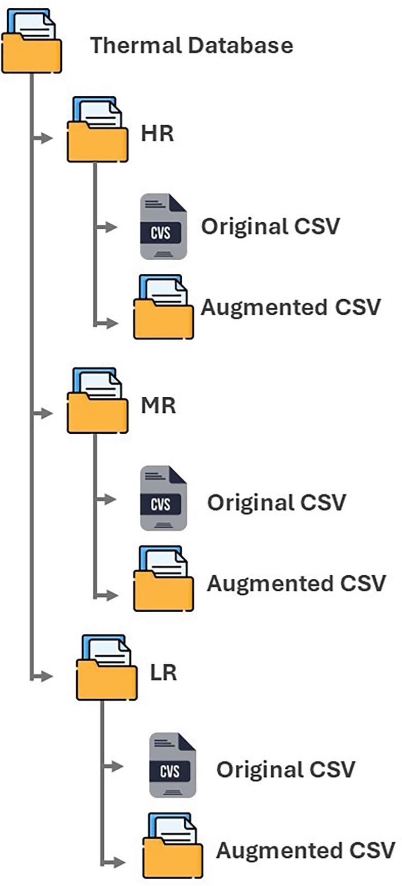 The dataset was divided into three main folders according to the spatial resolution: HR, MR, and LR. Each folder contains two subdirectories: Original/ (with the unmodified thermal images) and Augmented/ (with synthetic variations generated by resolution-specific data augmentation). The data augmentation was explained in the previous section.