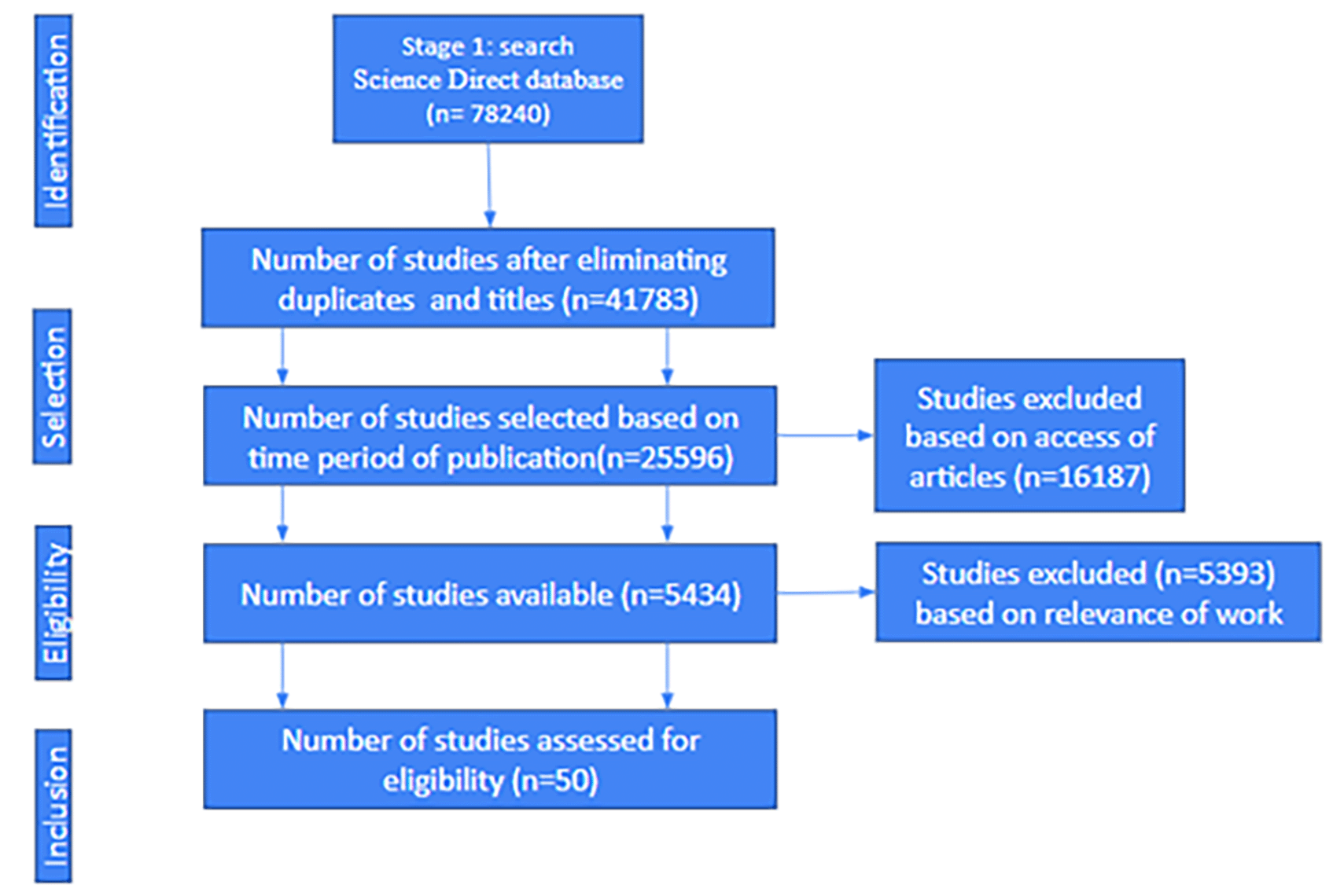 The PRISMA research model established in the studies conducted by Page et al. (2021) and How et al. (2022) is the primary research methodology adopted in the study. An initial search of the ScienceDirect database using keyword strings established led to the initial selection of approximately 78240 journal articles. In the subsequent stage, all duplicates and titles were eliminated from the database that was developed in the initial study, which led to the inclusion of only 41783 articles in the database. Next, all the articles selected were reviewed based on the time period of publication (published from 2018 to 2023), which led to the identification of 25596 articles that met the inclusion criteria and were unique. The next step involved the exclusion of all such articles that were not open access (or not accessible by general readers who may not have access to paid journals or databases), which led to the further exclusion of 16187 articles and the selection of 5434 articles for the final database. The abstracts of the selected articles were manually reviewed to ensure that each was in accordance with the research objectives and could provide unique insights, which led to the further exclusion of 5384 articles and the selection of only 50 articles, which are listed in the table below. The PRISMA model below provides a graphical representation of the entire procedure. The process is illustrated in Figure 1.