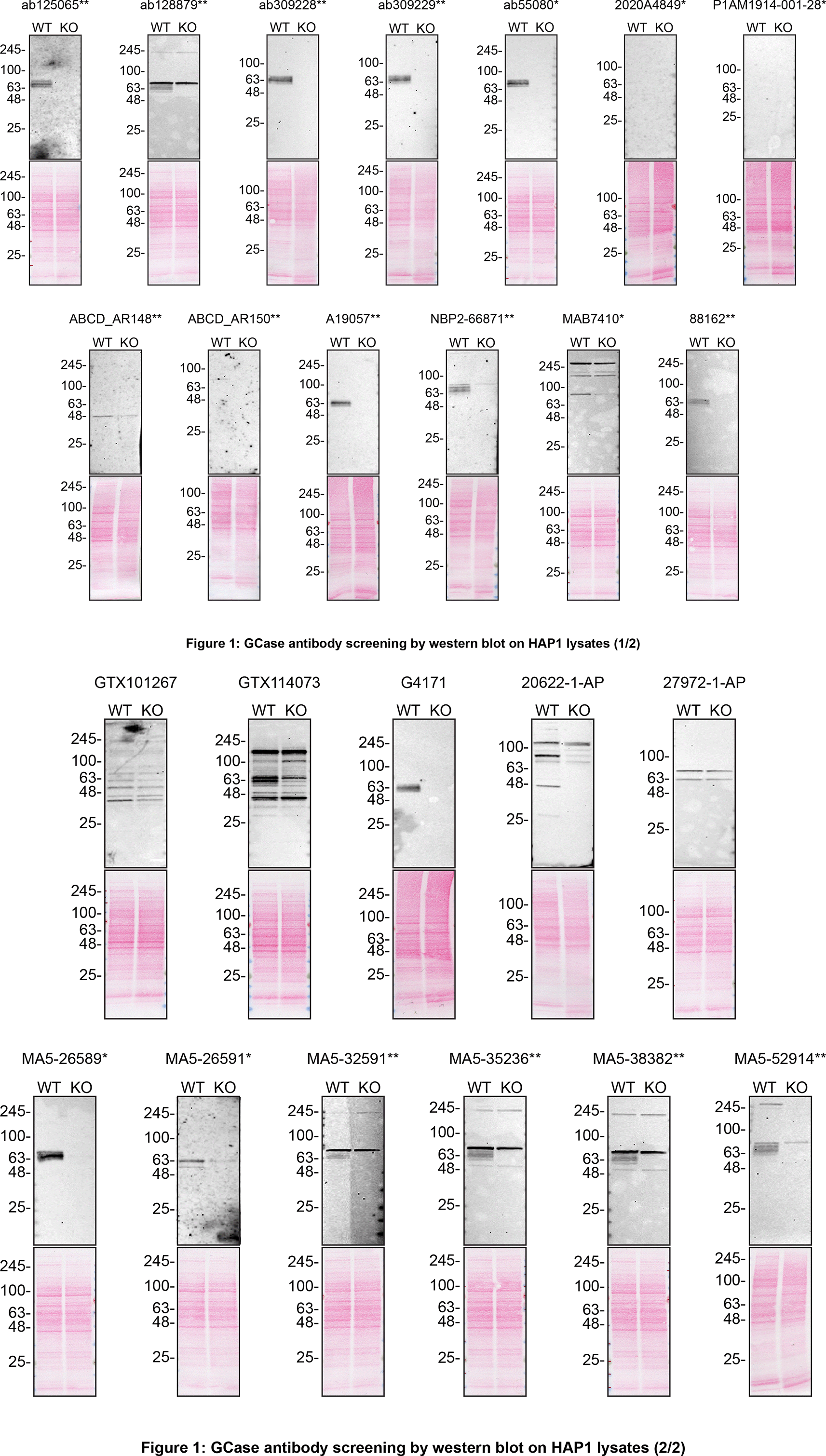 Lysates of HAP1 WT and GBA1 KO were prepared, and 30 μg of protein were processed for western blot with the indicated GCase antibodies. The Ponceau stained transfers of each blot are presented to show equal loading of WT and KO lysates and protein transfer efficiency from the acrylamide gels to the nitrocellulose membrane. Antibody dilutions were chosen according to the recommendations of the antibody supplier. Antibody dilutions used: ab125065** at 1/100, ab128879** at 1/1000, ab309228** at 1/200, ab309229** at 1/200, ab55080* at 1/500, 2020A4849* at 1/1000, P1AM1914-001-28* at 1/1000, ABCD_AR148** 1/50 (1 μg/mL), ABCD_AR150** at 1/20, A19057** at 1/1000, NBP2-66871** at 1/500, MAB7410* at 1/500, 88162** at 1/100, GTX101267 at 1/100, GTX114073 at 1/1000, G4171 at 1/1000, 20622-1-AP at 1/100, 27972-1-AP at 1/1000, MA5-26589* at 1/100, MA5-26591* at 1/100, MA5-32591** at 1/1000, MA5-35236** at 1/1000, MA5-38382** at 1/1000, and MA5-52914** at 1/1000. Predicted band size: 59.7 kDa. **= recombinant antibody, *= monoclonal antibody.