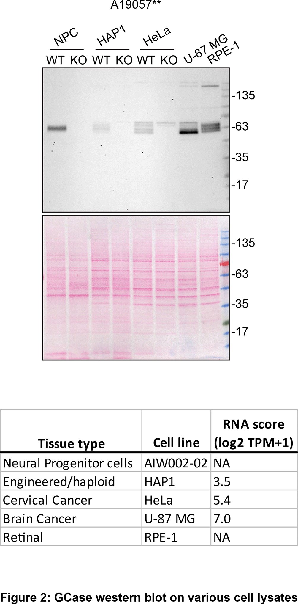 Lysates were prepared from WT and GBA1 KOs in HAP1, neural progenitor cells and HeLa as well as WT U-87 MG and RPE-1. 30 μg of protein were processed for western blot with anti-GCase A19057** diluted at 1/1000. Predicted band size: 59.7 kDa. **= recombinant antibody.
