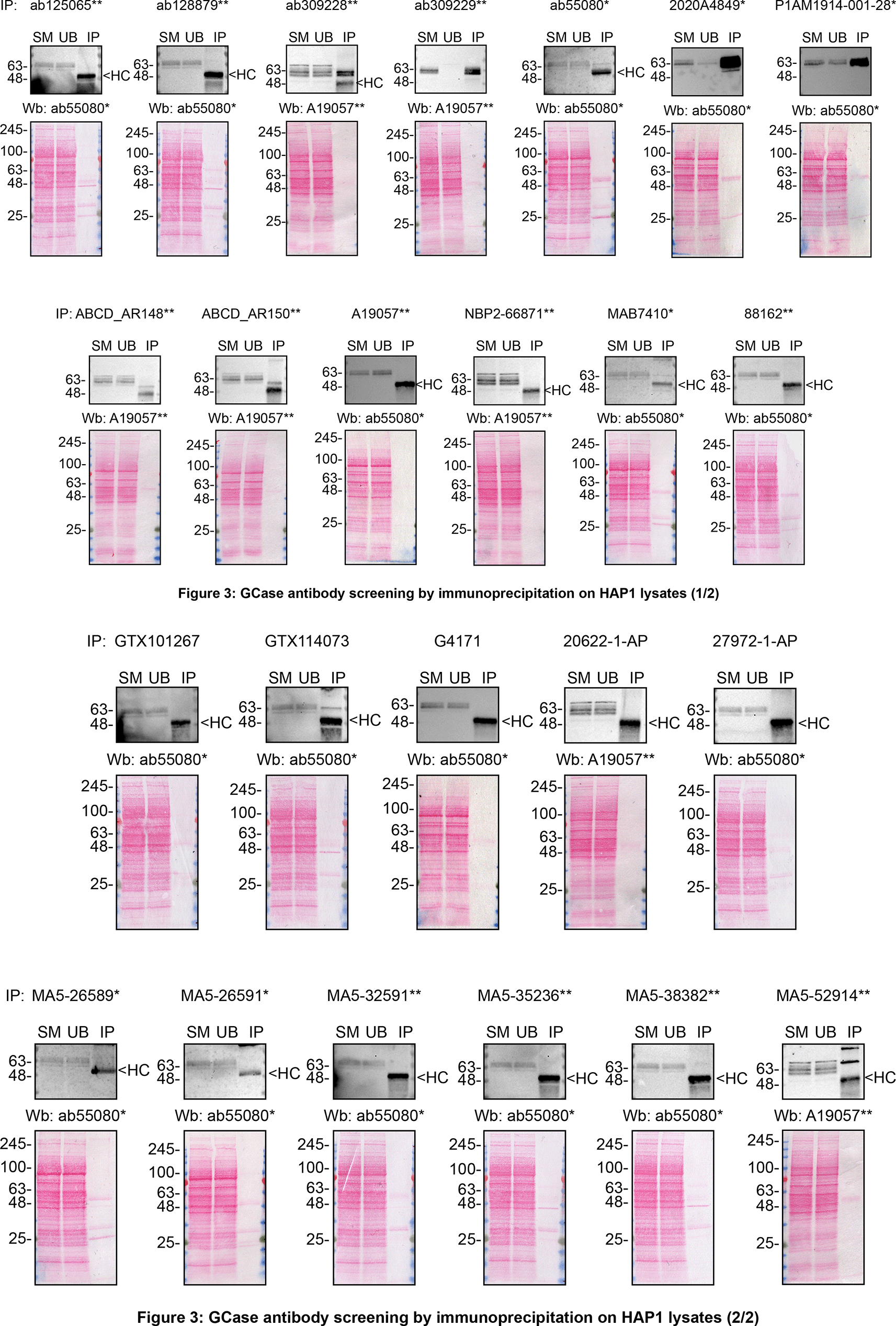 HAP1 lysates were prepared, and immunoprecipitation was performed using 1 mg of lysate and 2.0 μg of the indicated GCase antibodies pre-coupled to Dynabeads protein A or protein G. Samples were washed and processed for western blot with the anti-GCase ab55080* diluted at 1/500 or A19057** at 1/1000. The Ponceau stained transfers of each blot are shown. SM=4% starting material; UB=4% unbound fraction; IP=immunoprecipitate, HC= antibody heavy chain. **= recombinant antibody, *= monoclonal antibody.