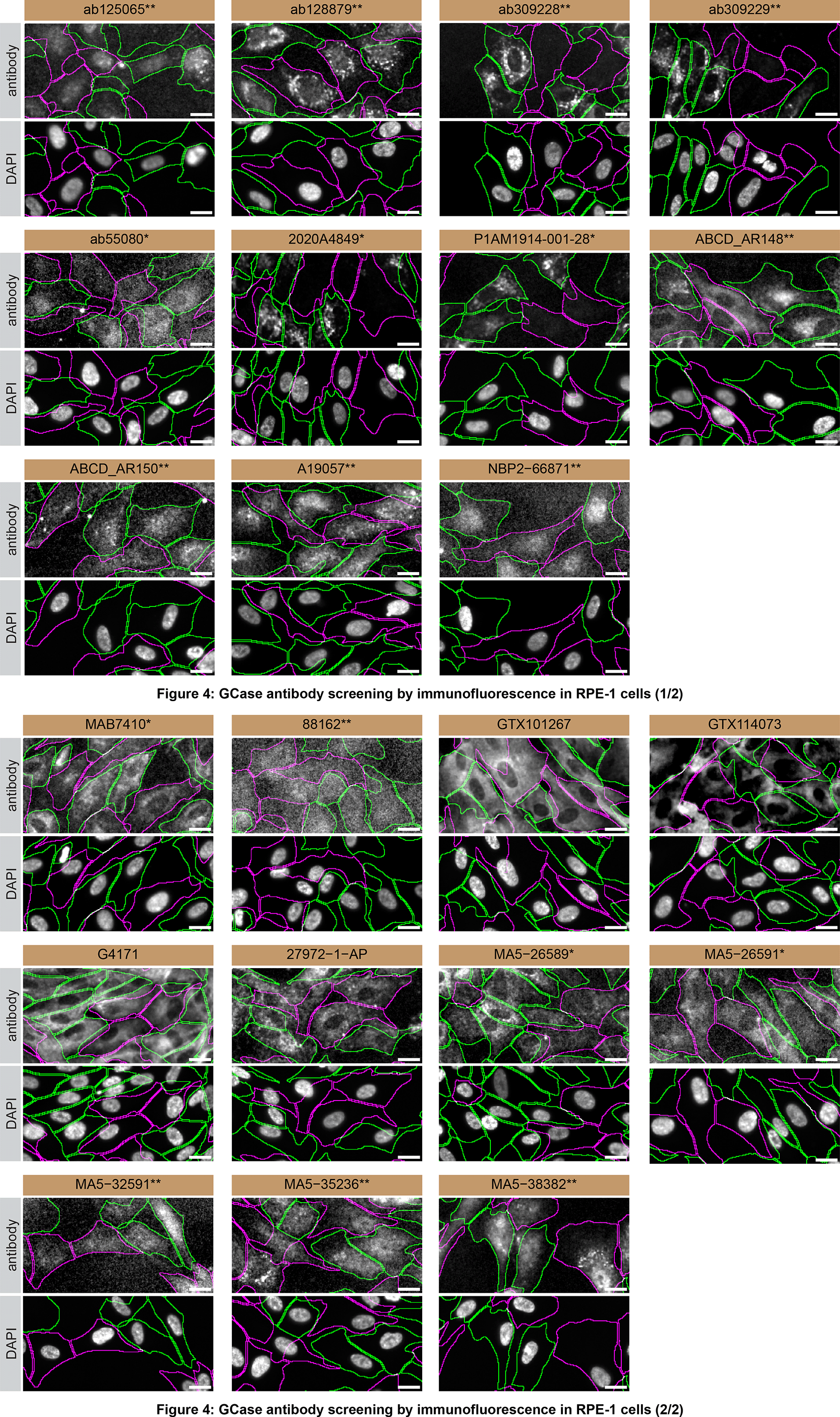 Based on the assessment of GCase expression in Figure 2, the highest expressing RPE-1 cells were selected for antibody screening in immunofluorescence. A KO cell line was generated by an academic partner in RPE-1 using CRISPR/Cas9. For immunofluorescence, twenty-two antibodies were screened using a mosaic strategy. First, RPE-1 WT and GBA1 KO cells were labelled with different fluorescent dyes in order to distinguish the two cell lines, and the GCase antibodies were evaluated. Both WT and KO lines imaged in the same field of view to reduce staining, imaging and image analysis bias ( Figure 4). Quantification of immunofluorescence intensity in hundreds of WT and KO cells was performed for each antibody tested, and the images presented in Figure 4 are representative of this analysis.3