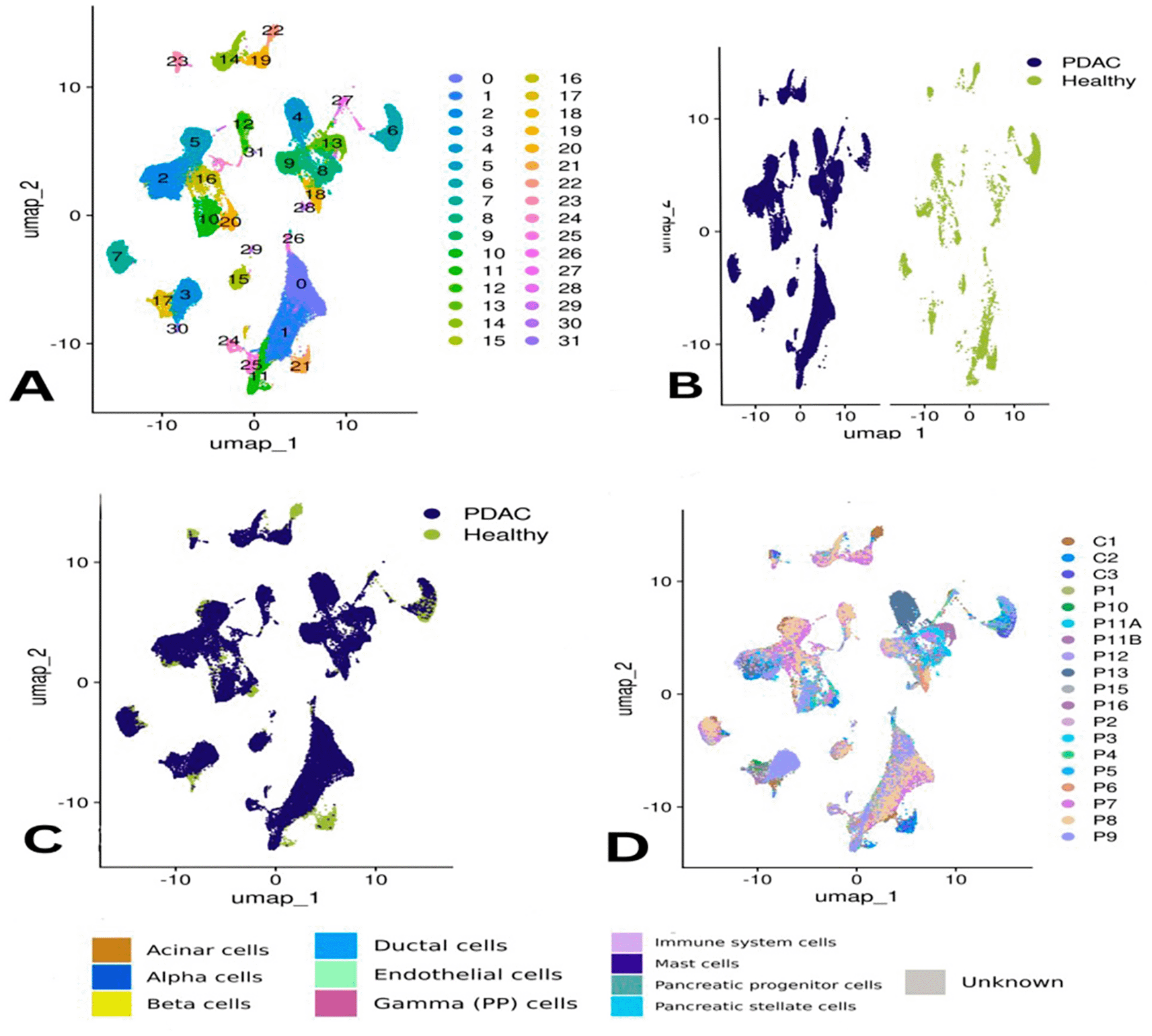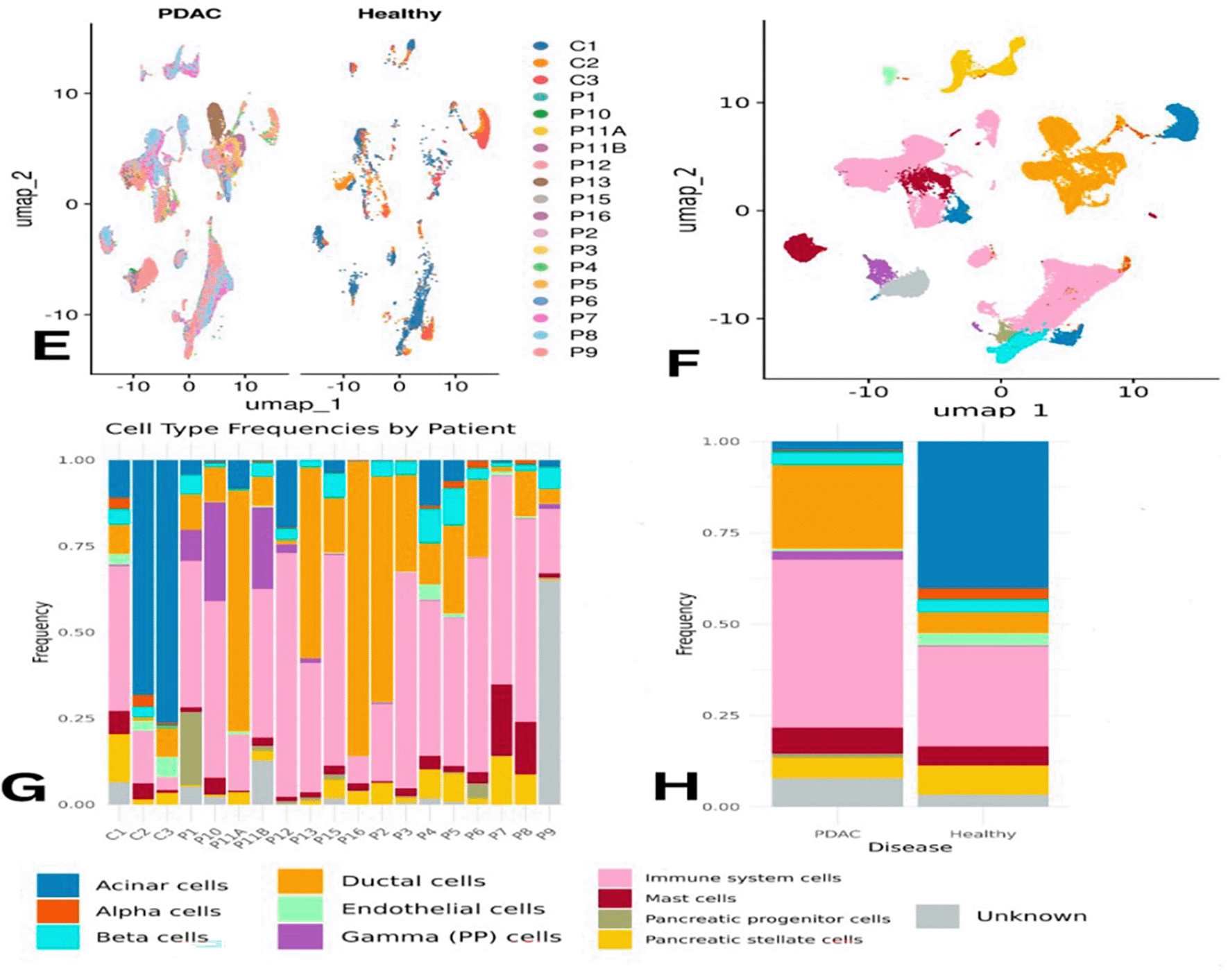 The overall clustering of PDAC and healthy cells was visualized using UMAP ( Figure 1).