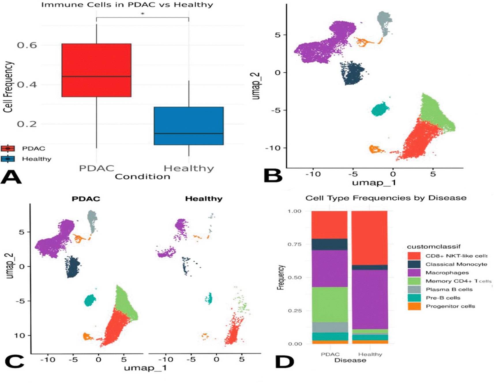 Due to the statistically significant difference in immune cell abundance between PDAC and healthy samples, immune system cells were subsetted and subclustered to identify their subtypes. Using the scType database with immune markers, the following cell types were annotated: CD8+ NKT-like cells, Classical Monocytes, Macrophages, Memory CD4+ T cells, Plasma B cells, Pre-B cells, and Progenitor cells ( Figure 3B).