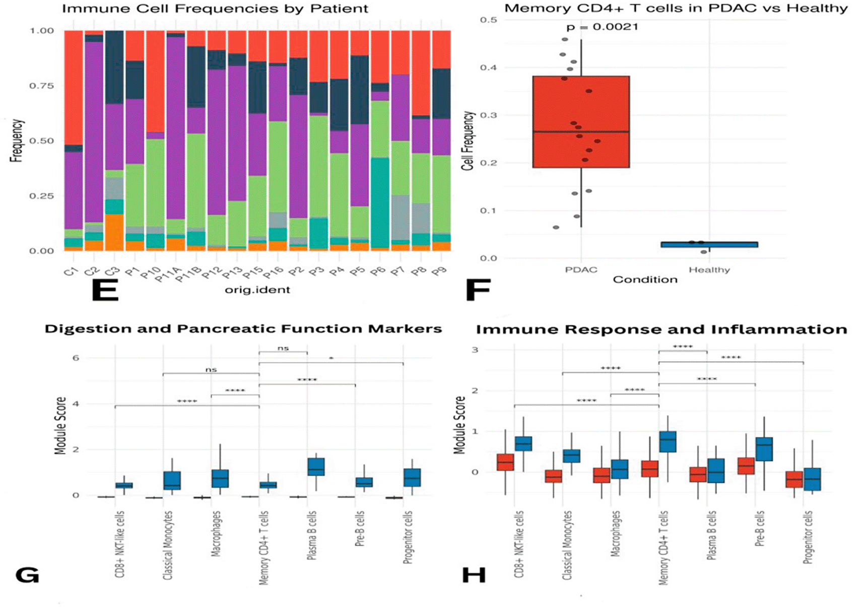 When comparing PDAC and healthy samples collectively, immune cells were the most abundant in PDAC, accounting for approximately 45% of the total population versus ~20% in healthy tissue. Conversely, acinar cells were more frequent in healthy samples (~35%) but dropped to ~2% in PDAC. Ductal cells increased in PDAC (~25%) compared to ~5% in controls ( Figure 2H). The distribution of some cell types was uneven across individual samples ( Figure 2G). Statistical analysis confirmed that immune cells were significantly more prevalent in PDAC, underlining their central role in the tumor microenvironment ( Figure 3A).