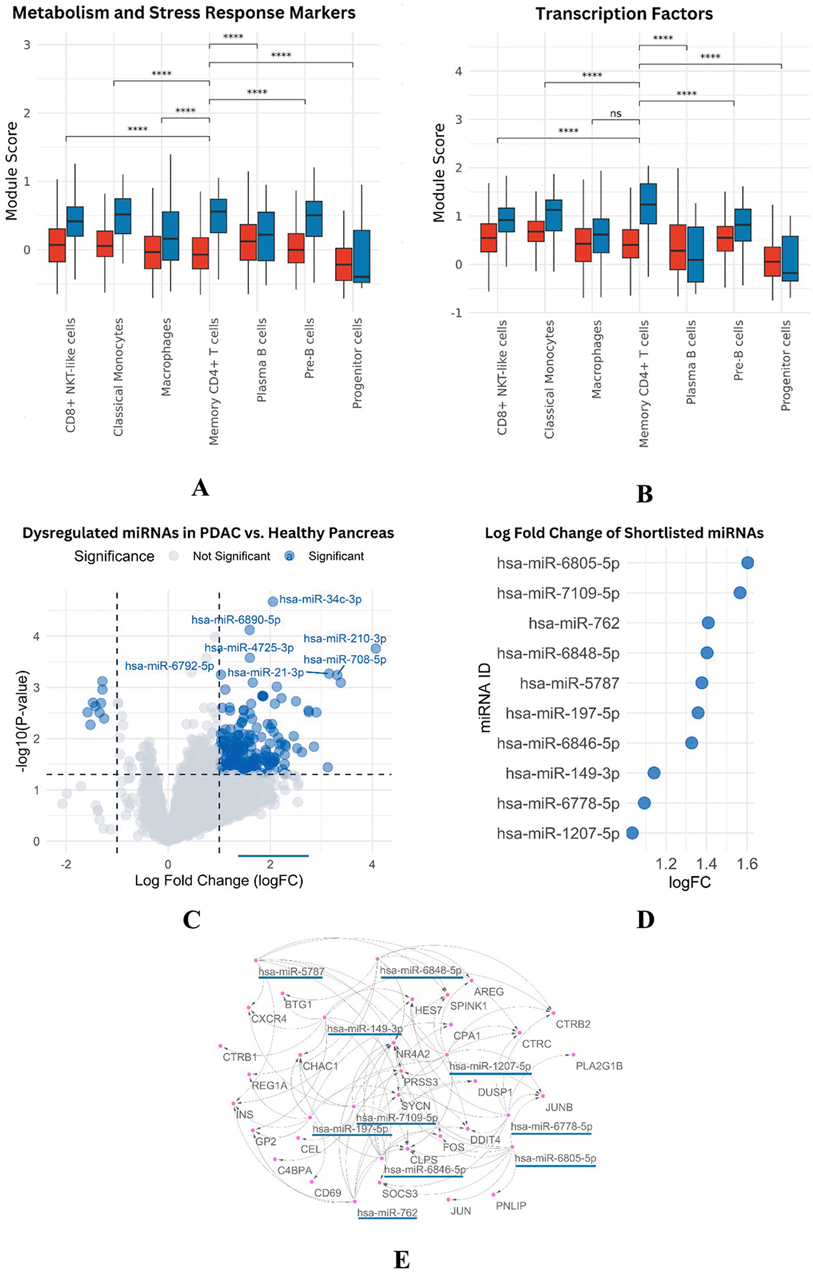 For cell types and differentially expressed genes in memory CD4+ T cells, scRNA-seq was conducted on PDAC and non-tumoral pancreas samples. Putative miRNA targeting sequences on downregulated genes were investigated by three prediction databases, MiRWalk, TargetScan, and miRDB, and compared to GSE207345’s differential expression with creation of Affymetrix Multispecies miRNA-4 Array. The miRNA–mRNA interaction network was established in Cytoscape.