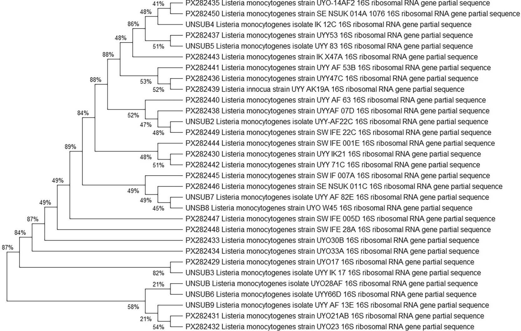 To elucidate the genetic relatedness and evolutionary relationships among the Listeria isolates collected in this study, a phylogenetic tree was constructed based on partial 16S rRNA gene sequences. The analysis included a total of thirty-two isolates recovered from various locations and sources across Nigeria. The sequences were aligned, and a phylogenetic tree was inferred using the Maximum Likelihood method. As shown in Figure 1, the isolates clustered into distinct clades, confirming their identification as Listeria monocytogenes and revealing their phylogenetic grouping. Notably, the tree also illustrates the genetic diversity and potential evolutionary paths among the strains, with bootstrap values indicating the robustness of the major nodes. The inclusion of a Listeria innocua strain (PX282439) served as an outgroup to root the tree and provide a point of evolutionary reference.